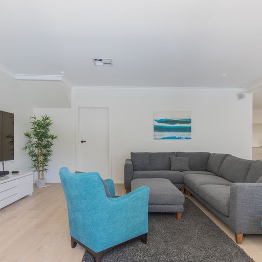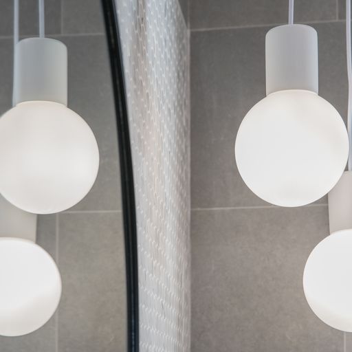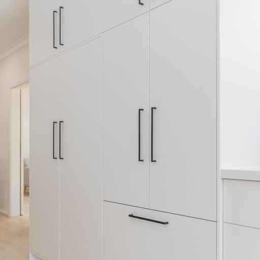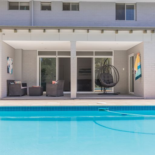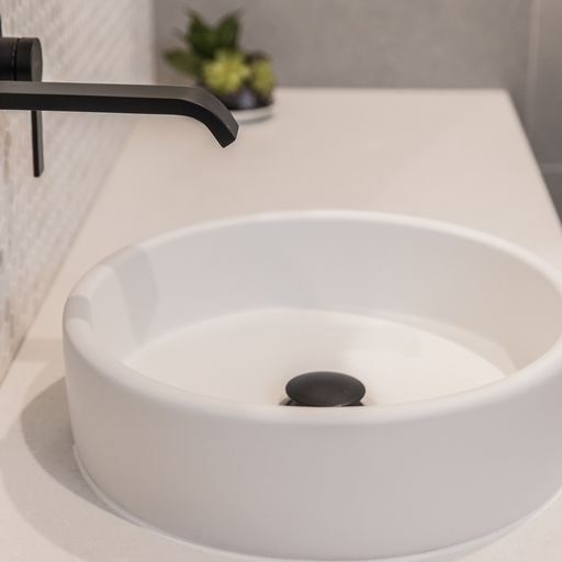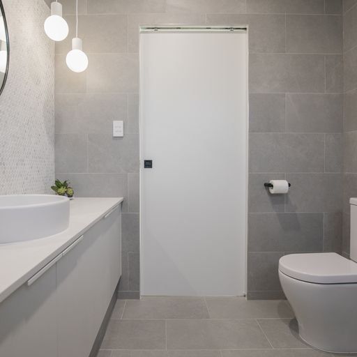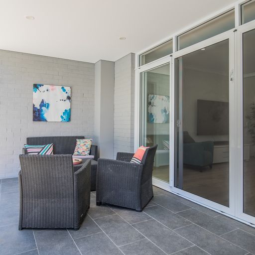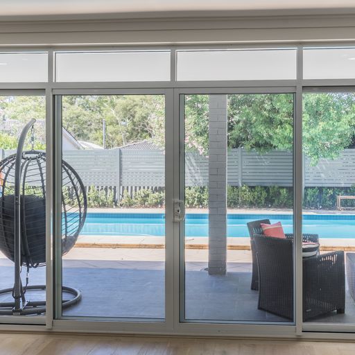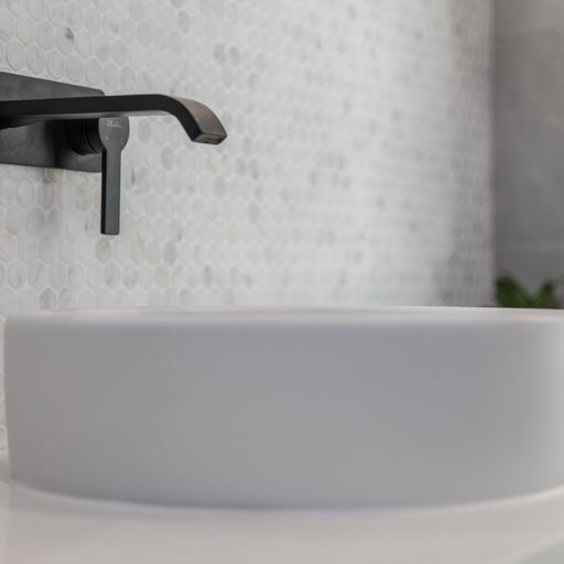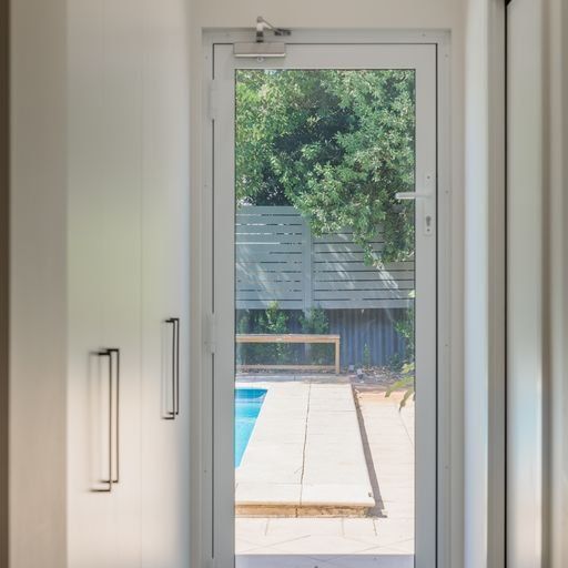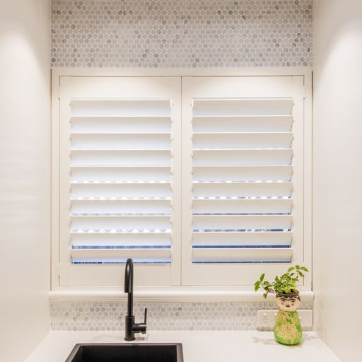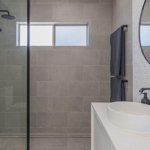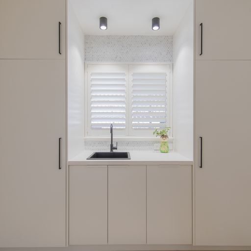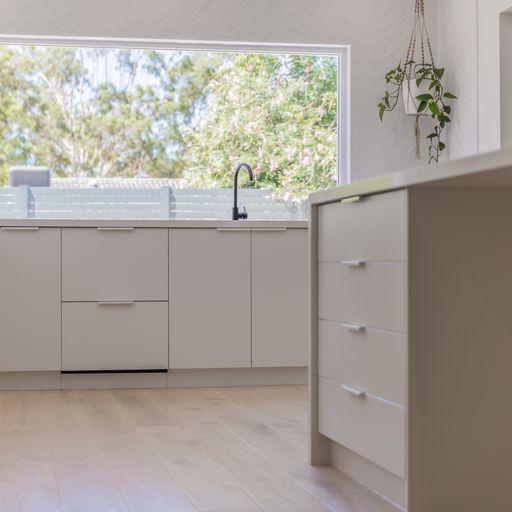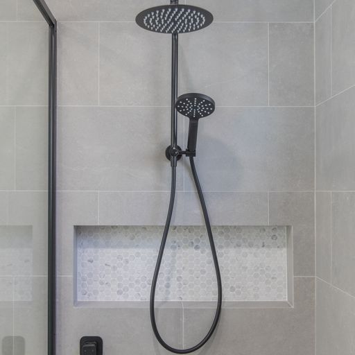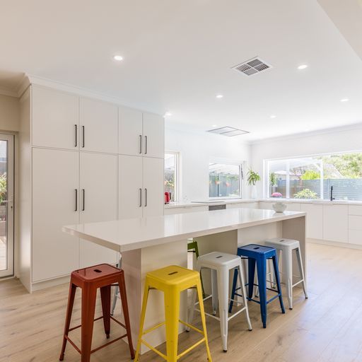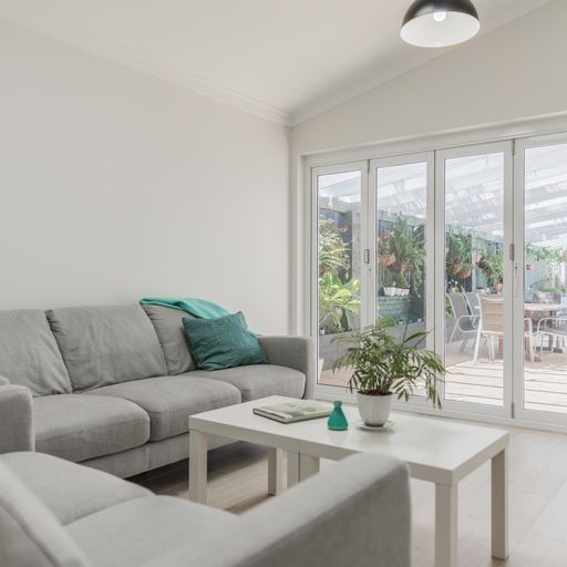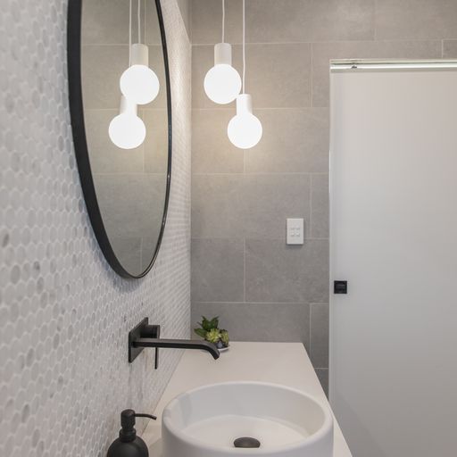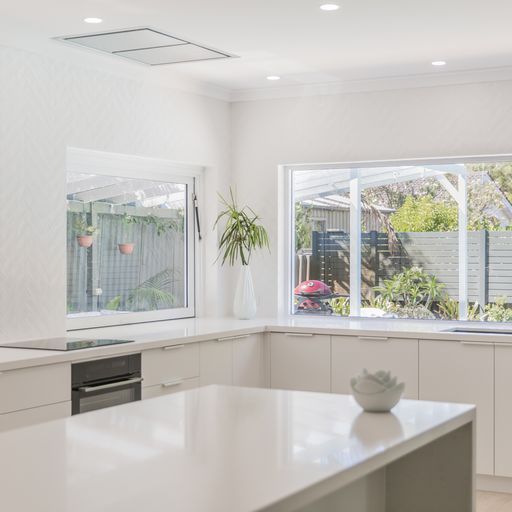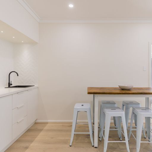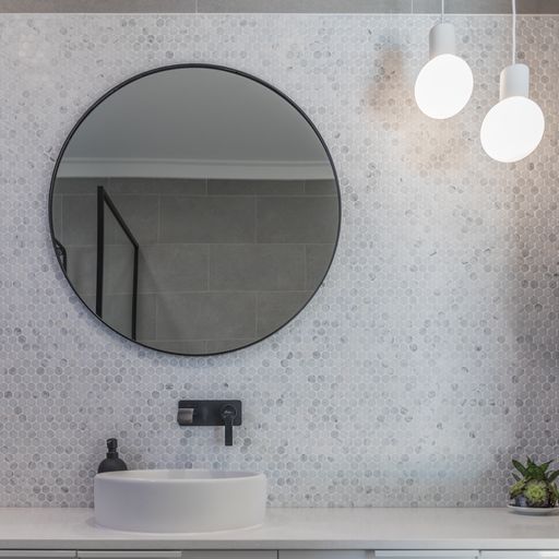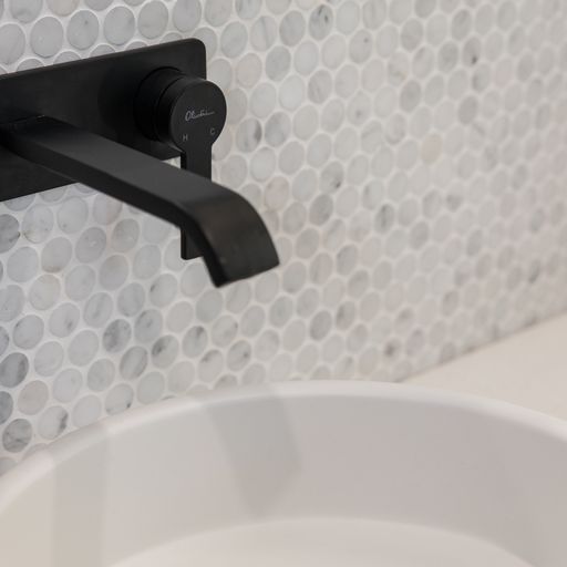 White, marble mosaic tiles are contrasted with matt black frames and tapware throughout. New, large format glazing ensures an abundance of natural light floods the open plan.