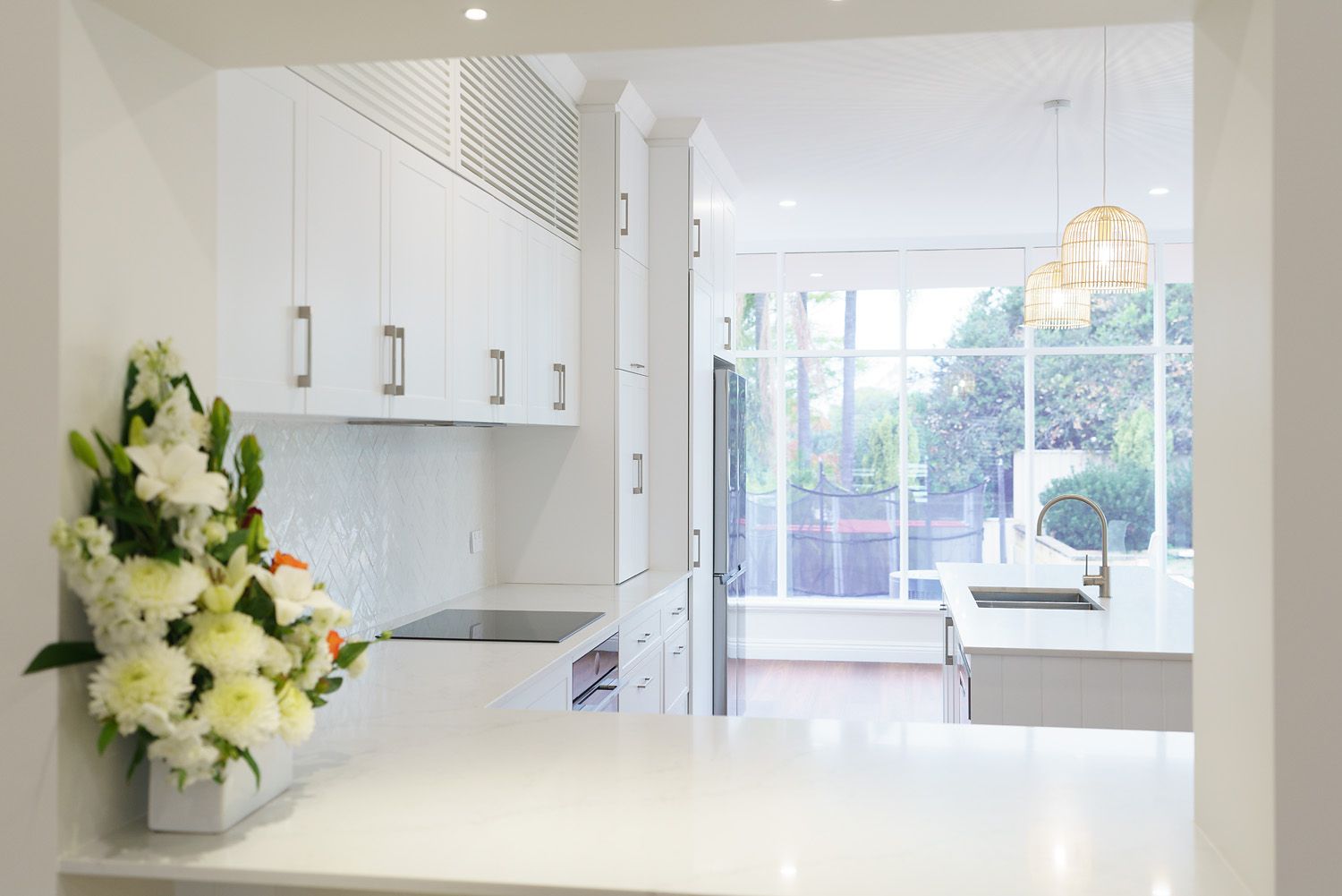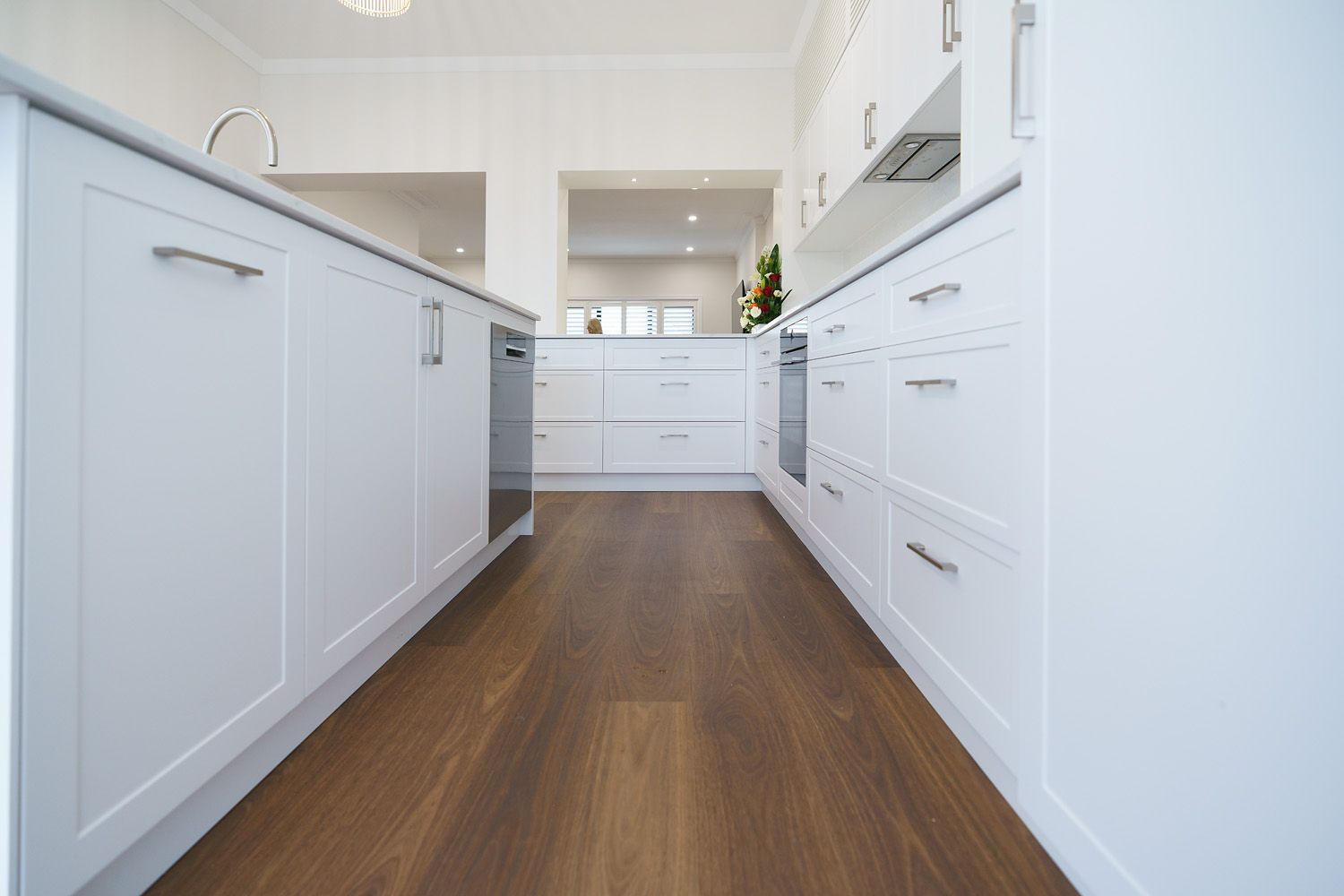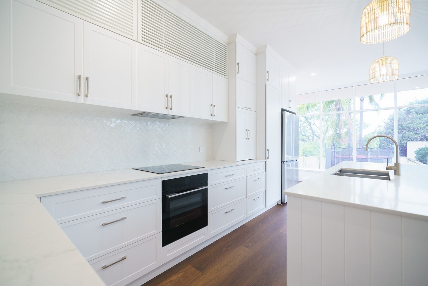 This renovation transformed tired flooring, wall finishes and cabinet work into an amazingly warm and contemporary space.