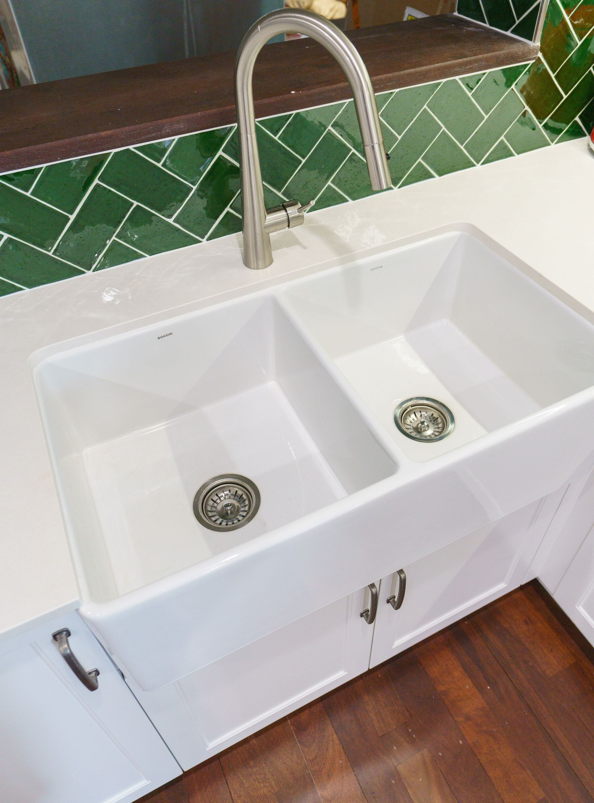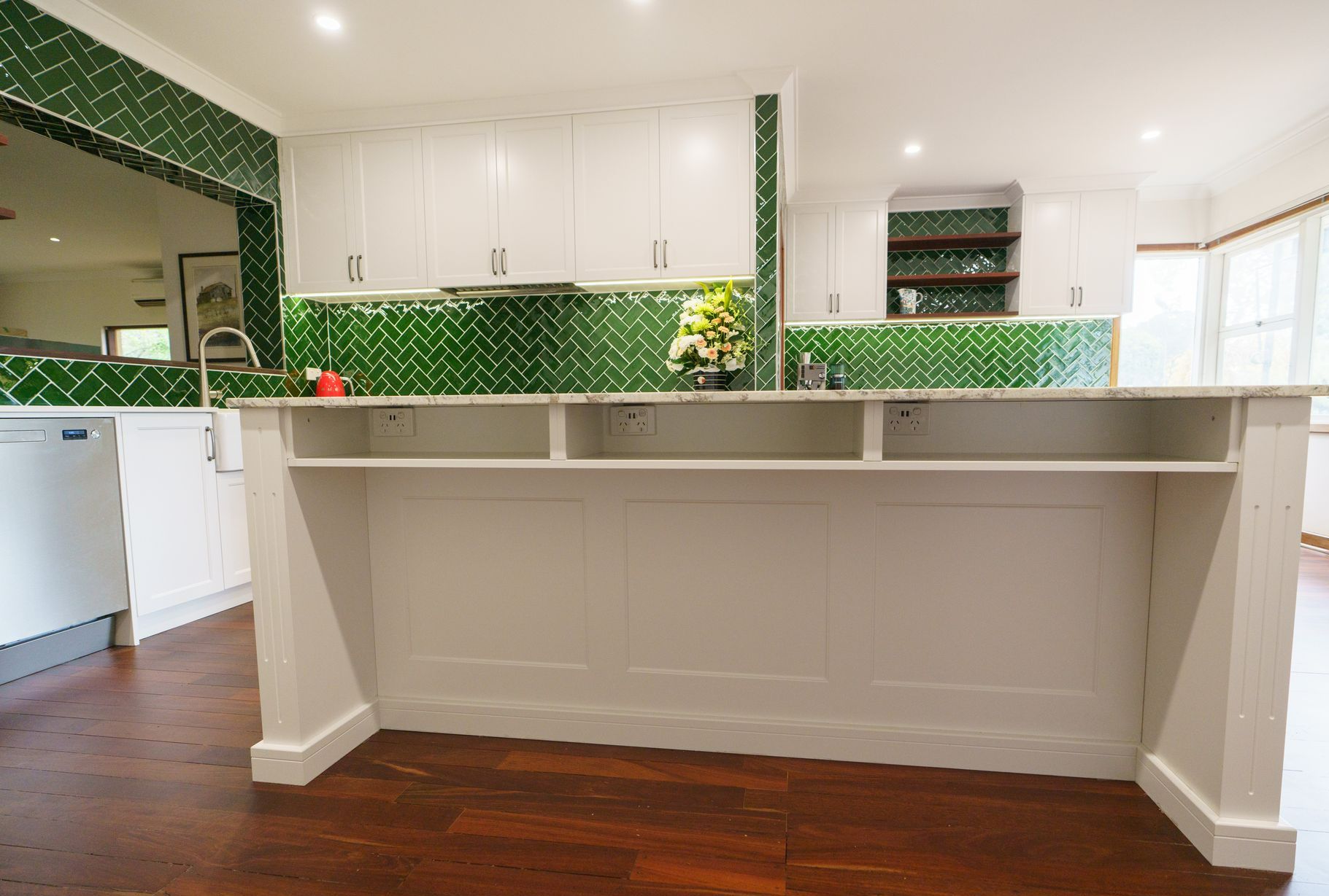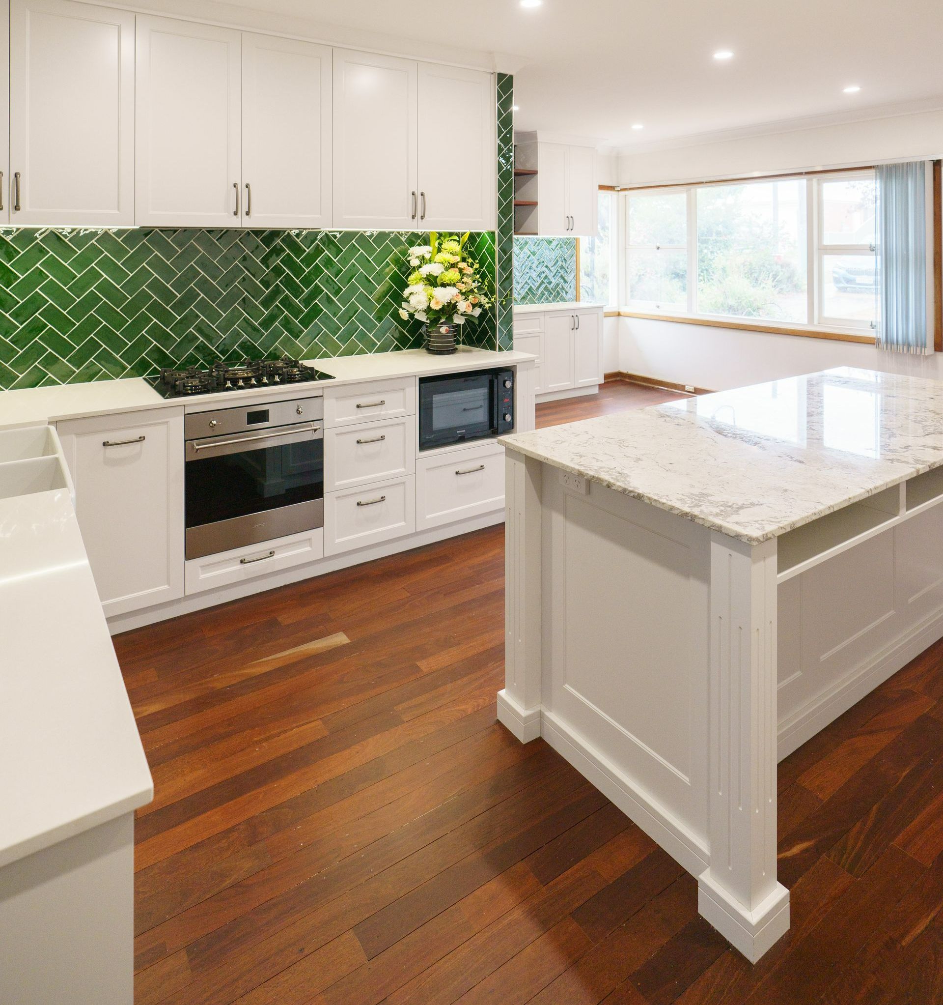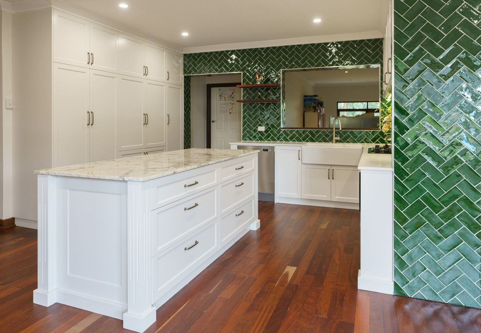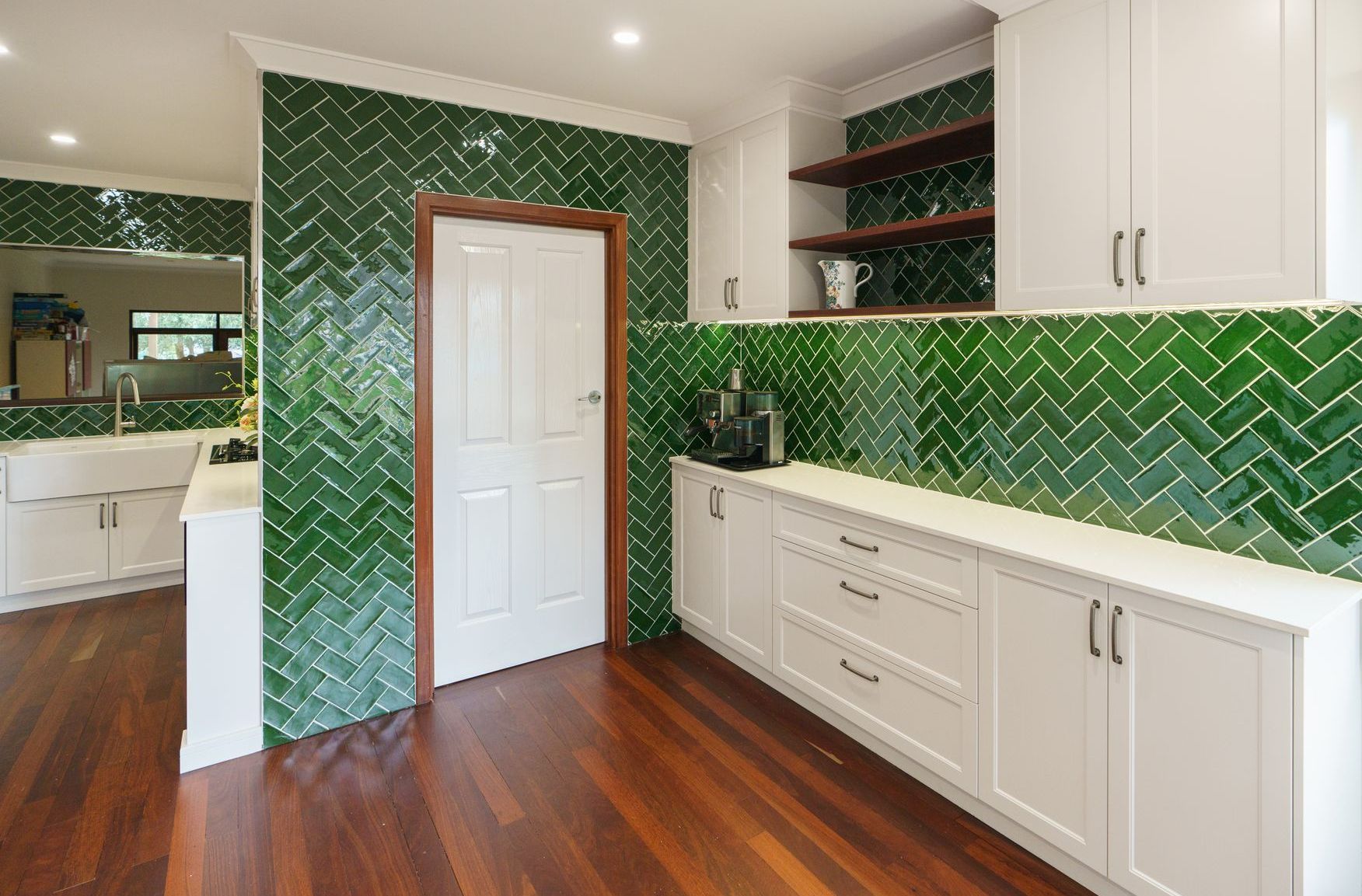 Bold, high gloss tiles frame this beautiful custom kitchen, laundry and family room renovation.