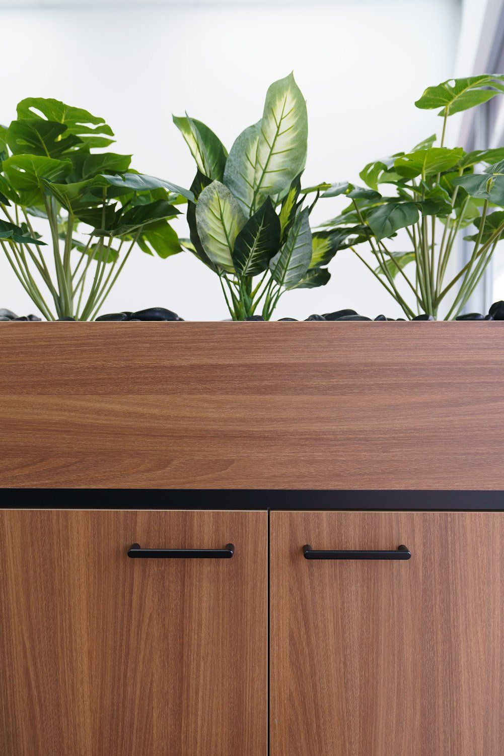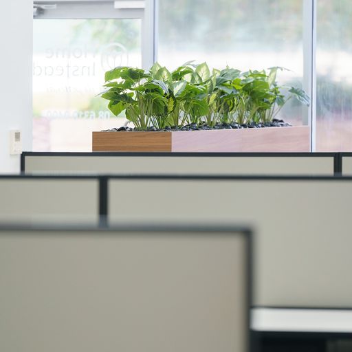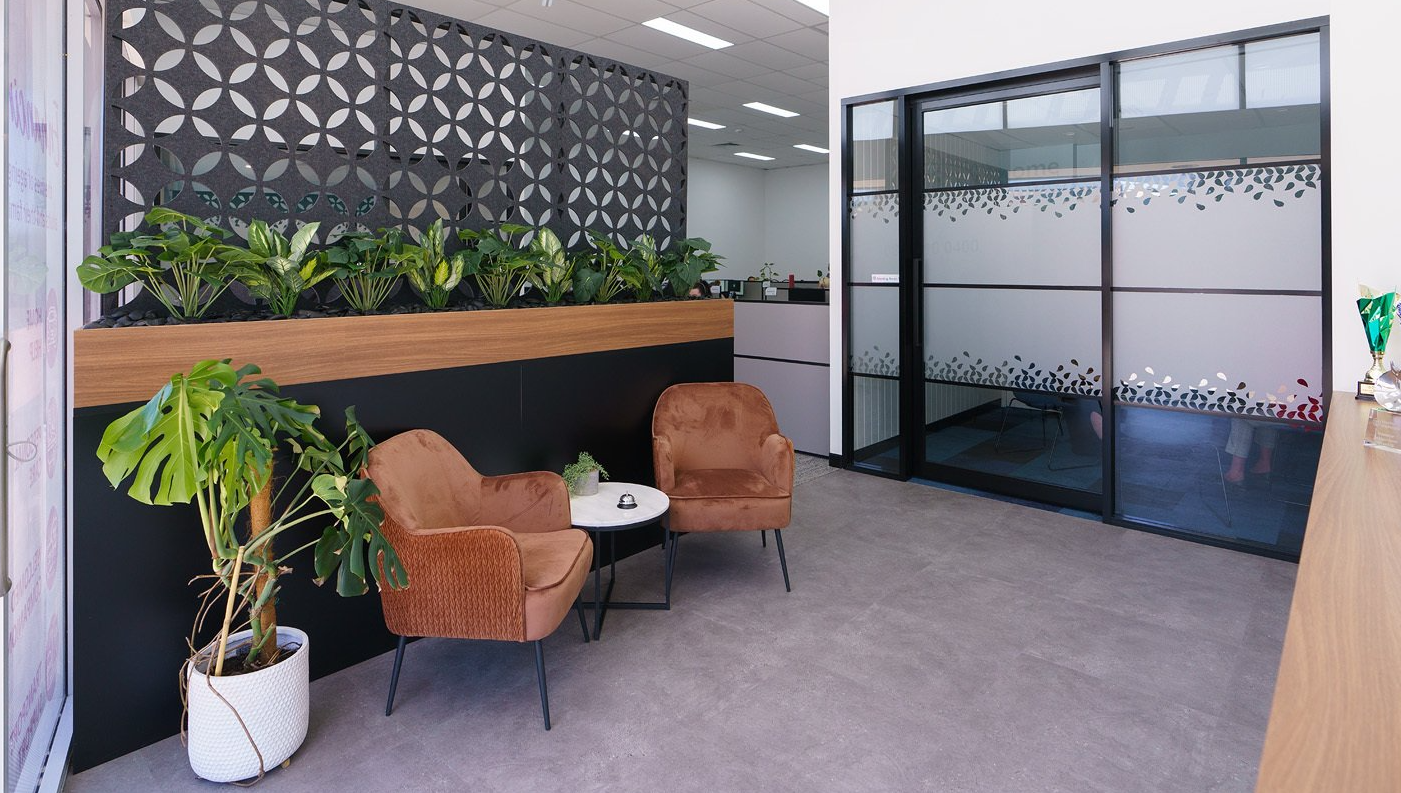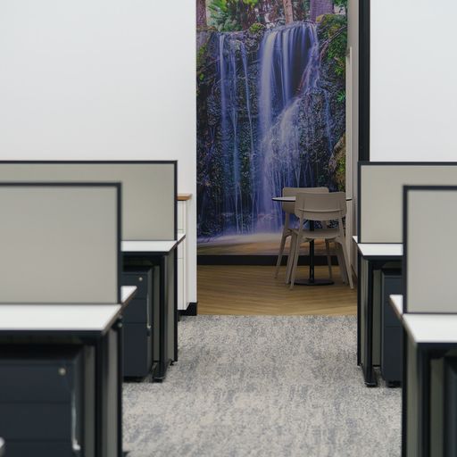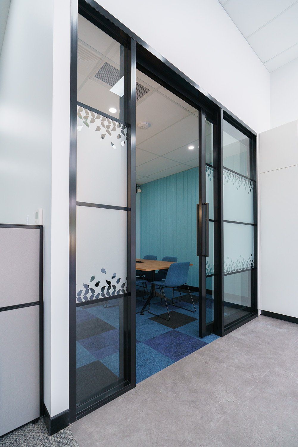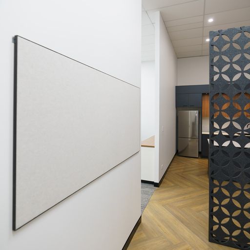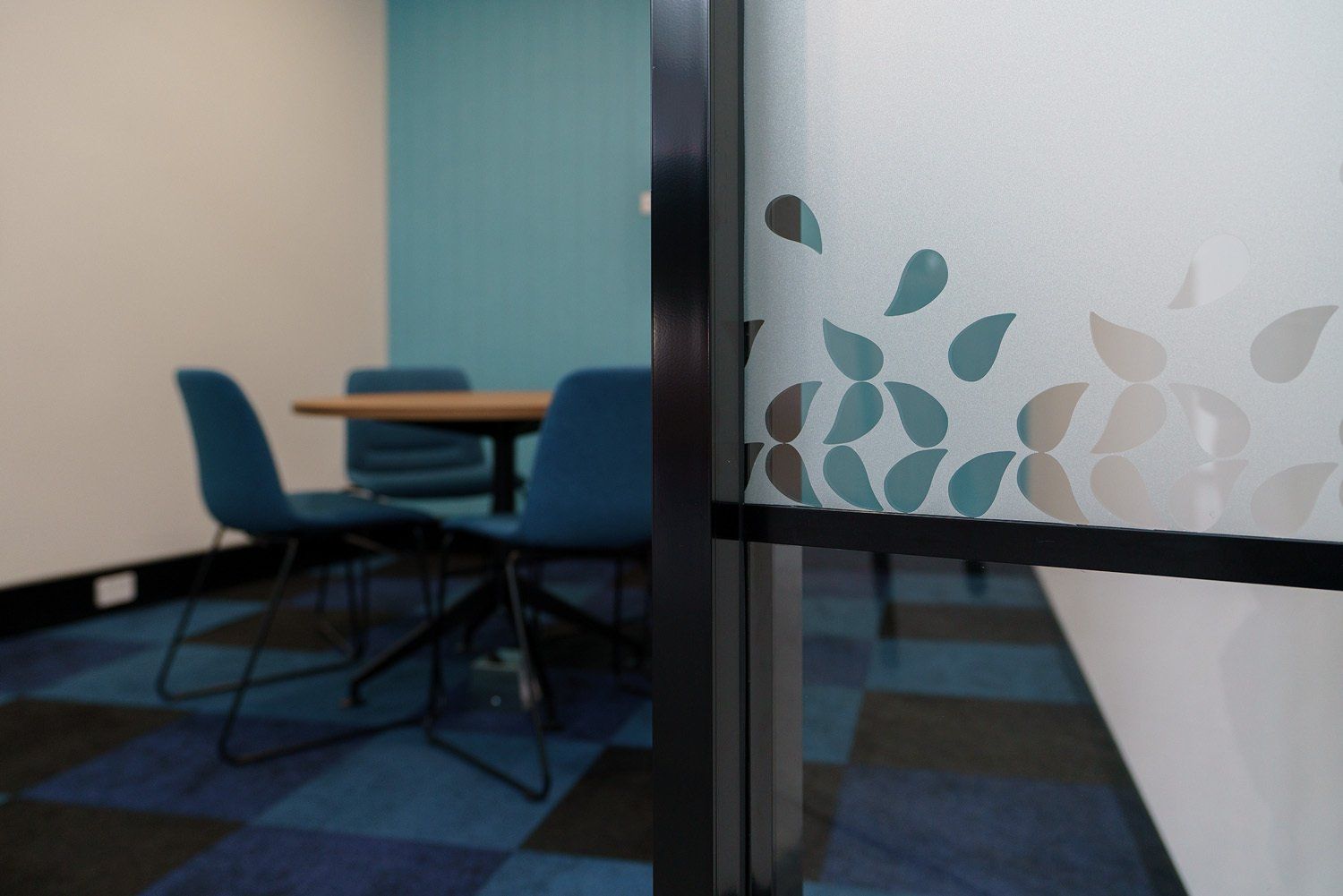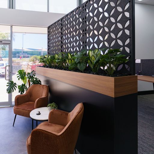 Natural light and modern furniture, with attention to acoustics ensures this office functions as intended. Custom paneling, glazing treatments, plants and wall images complements this business's culture.