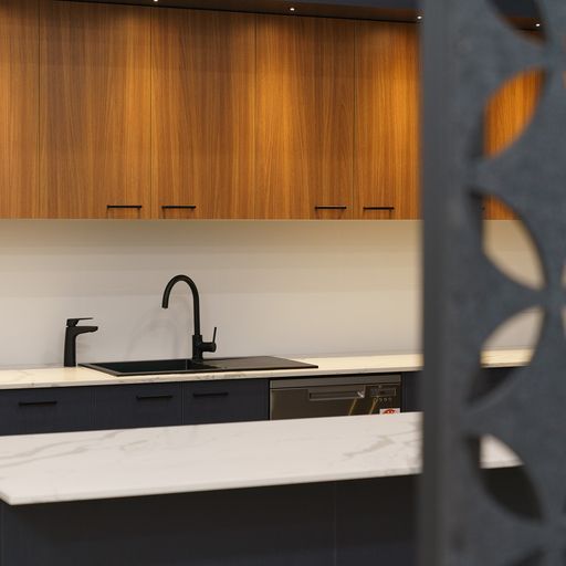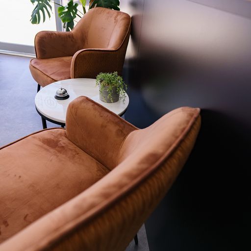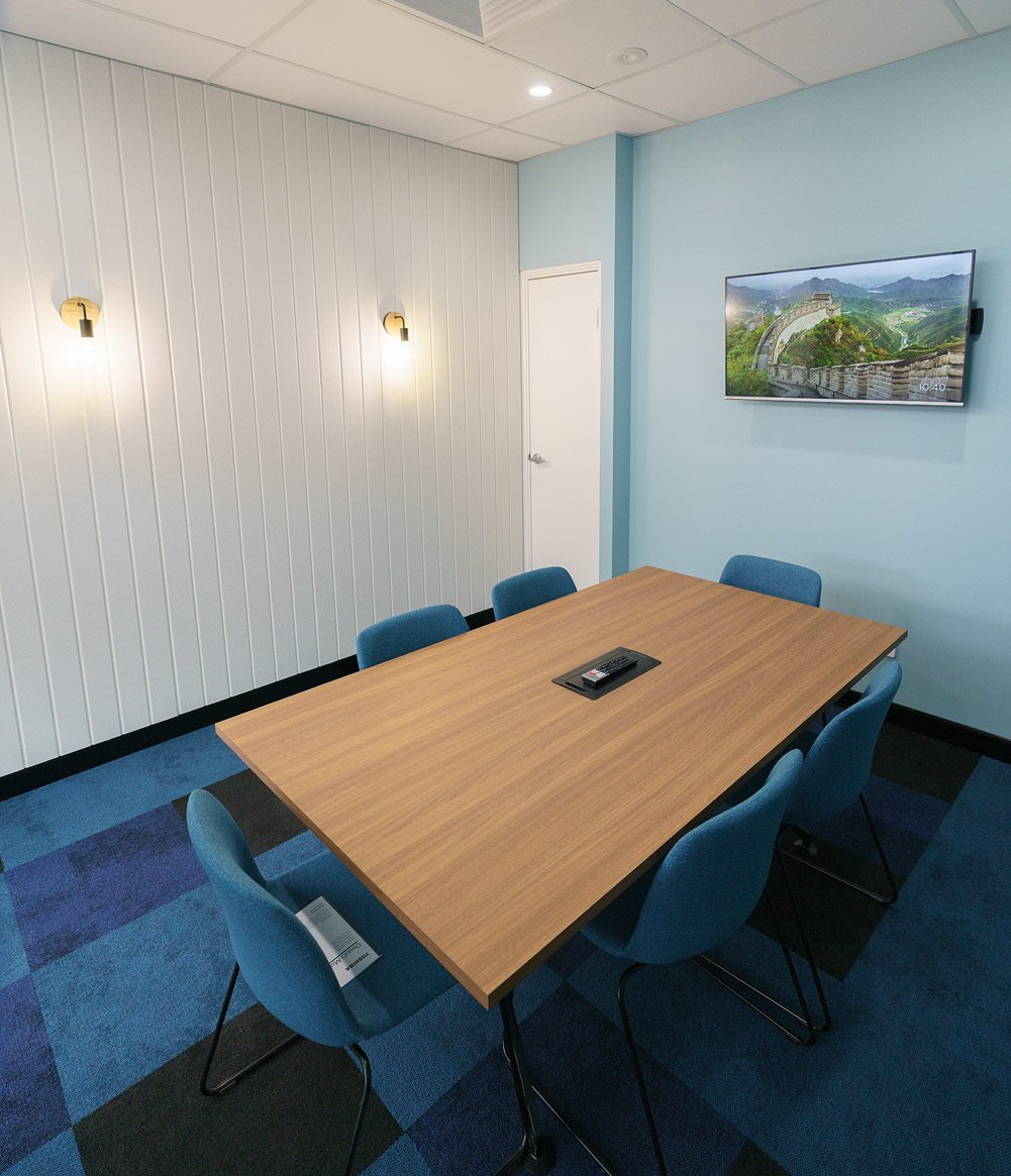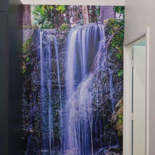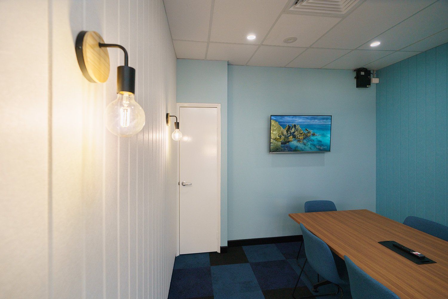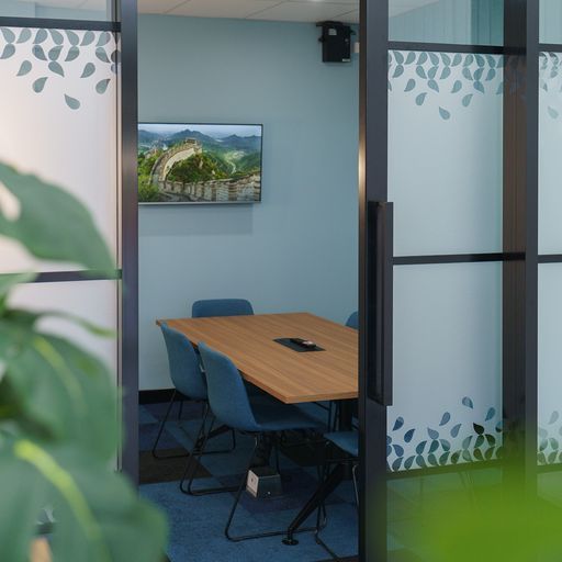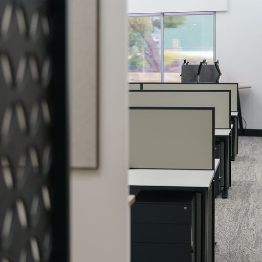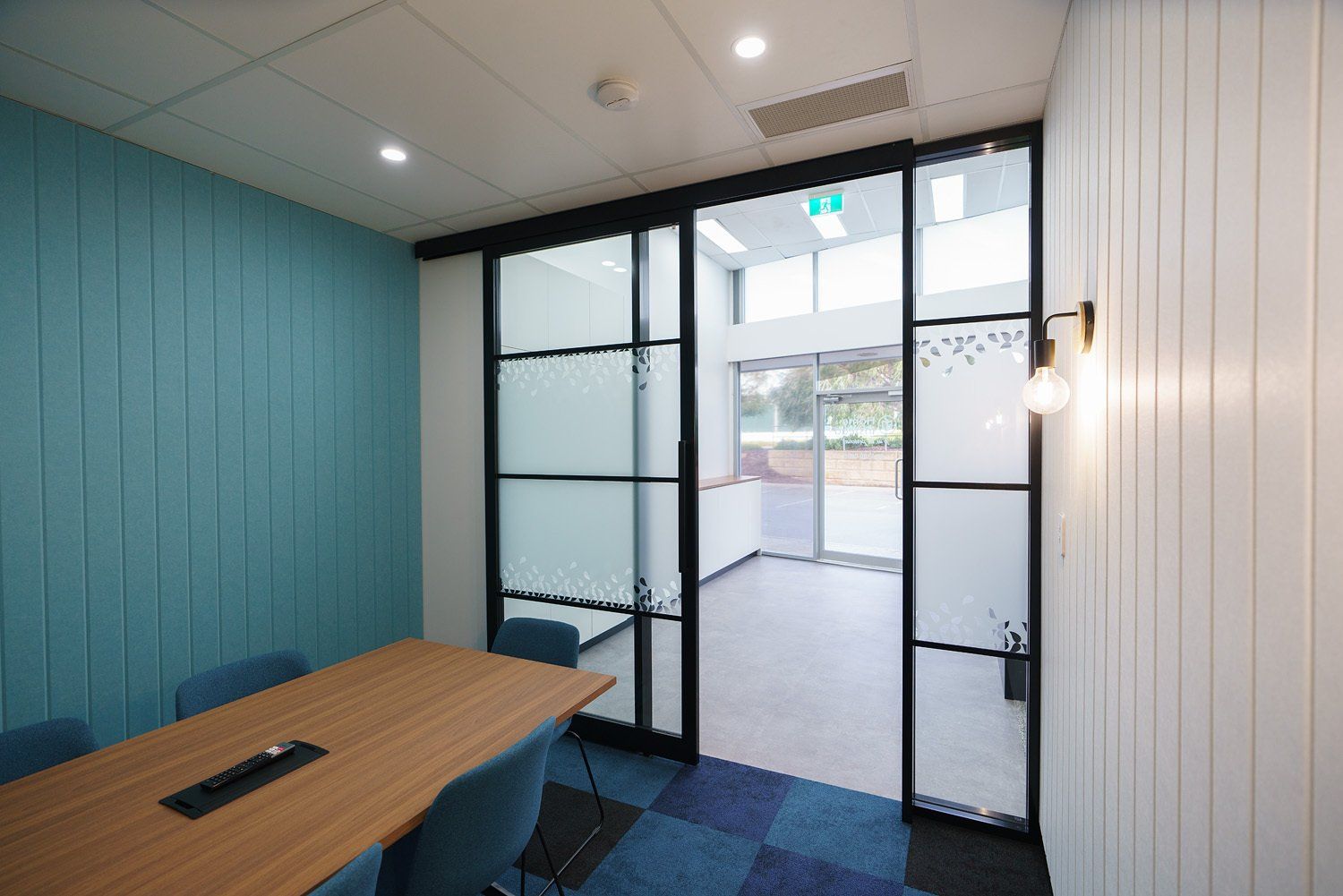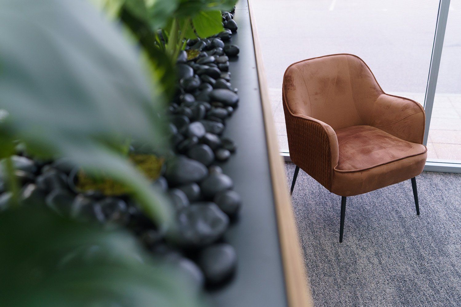 Natural light and modern furniture, with attention to acoustics ensures this office functions as intended. Custom paneling, glazing treatments, plants and wall images complements this business's culture.