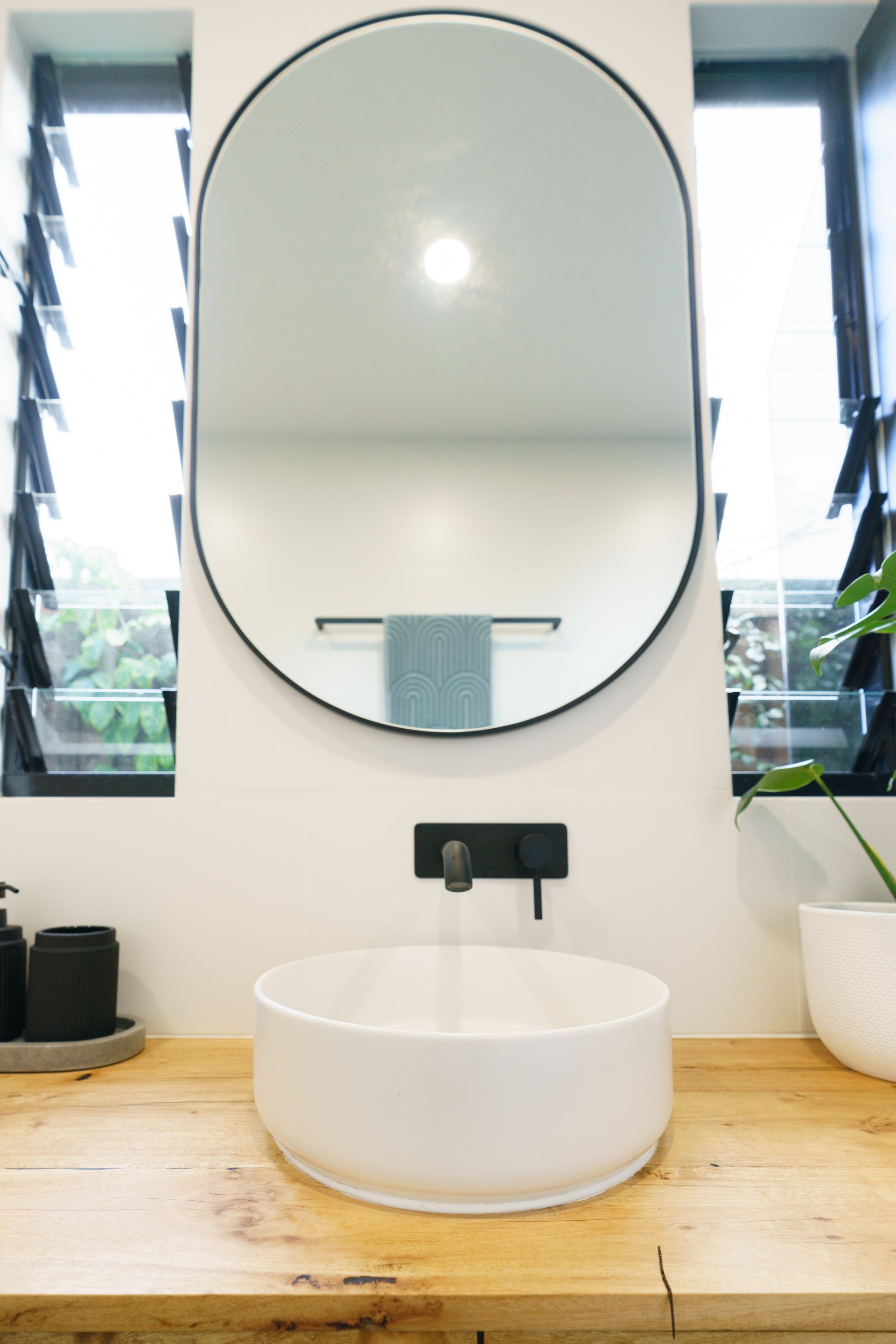 Beautiful louvered windows and an abundance of natural light make this space calm and inviting.