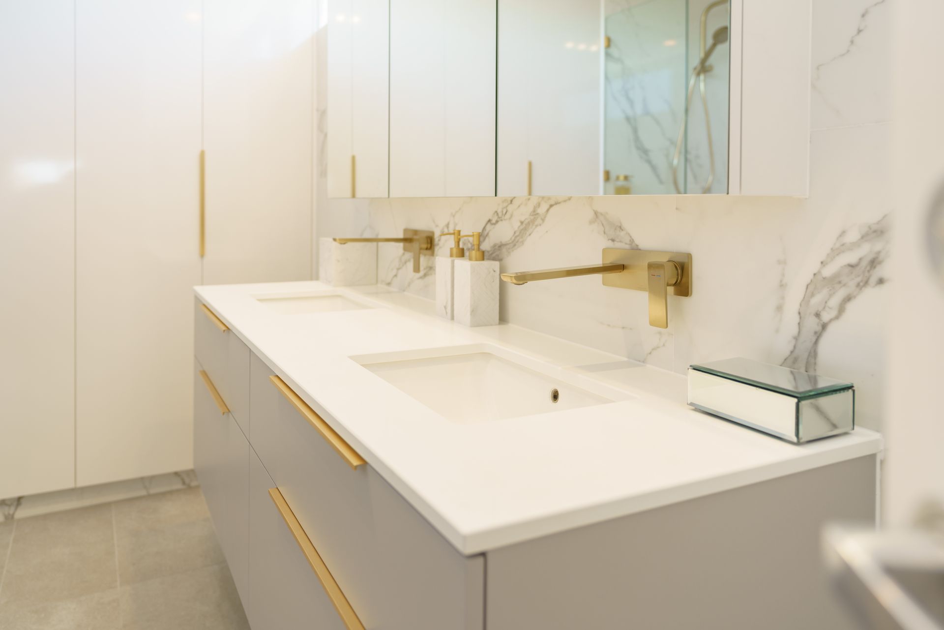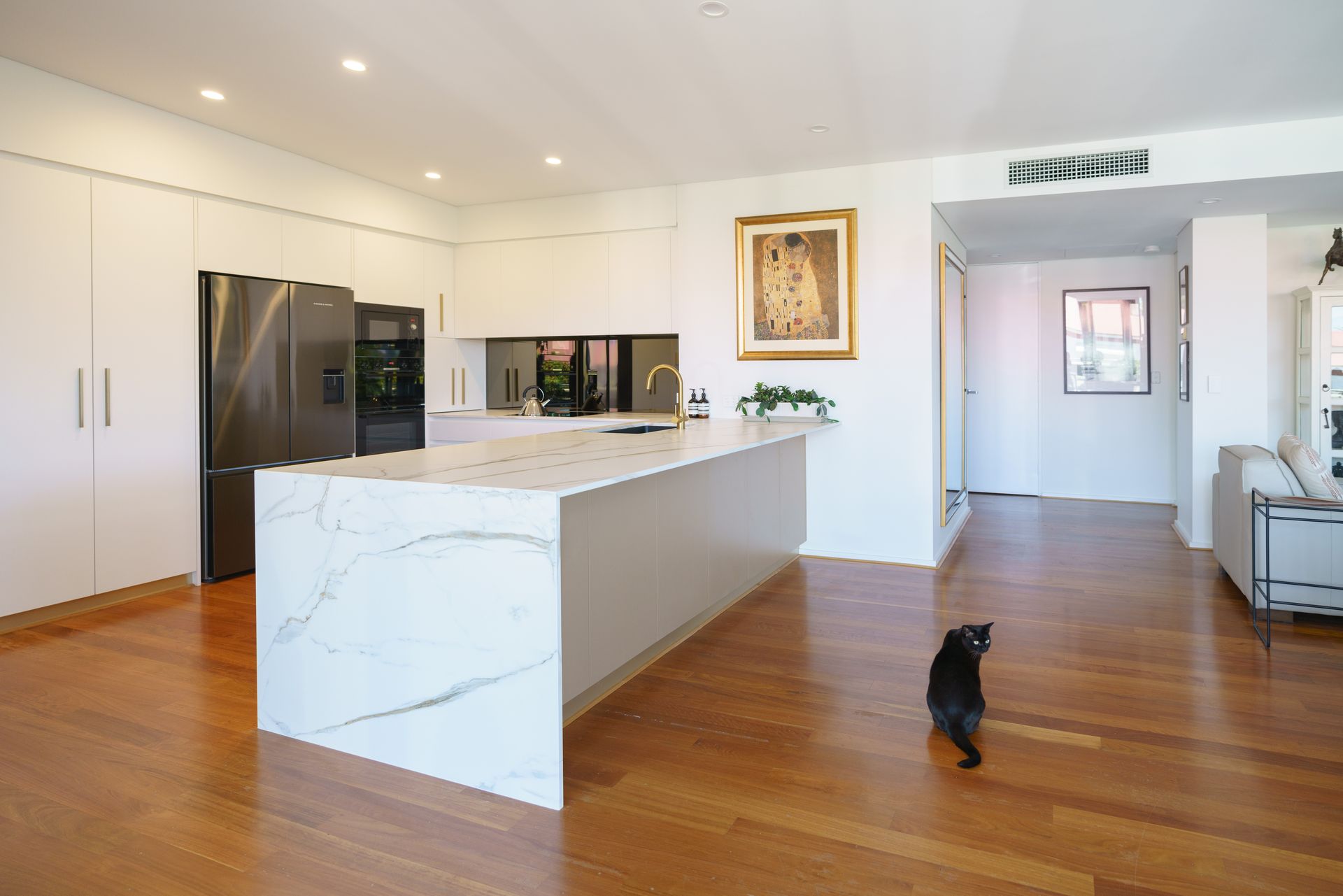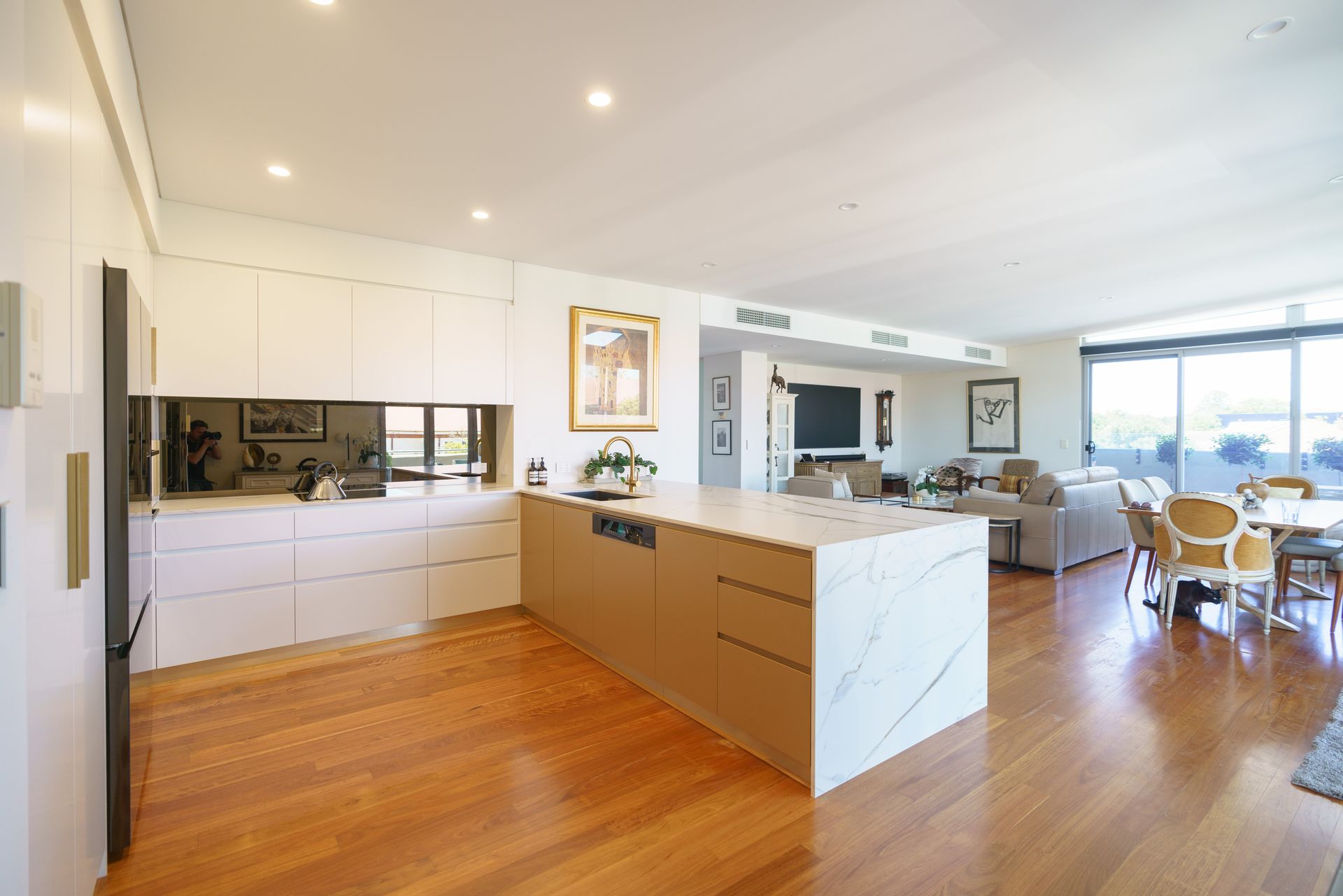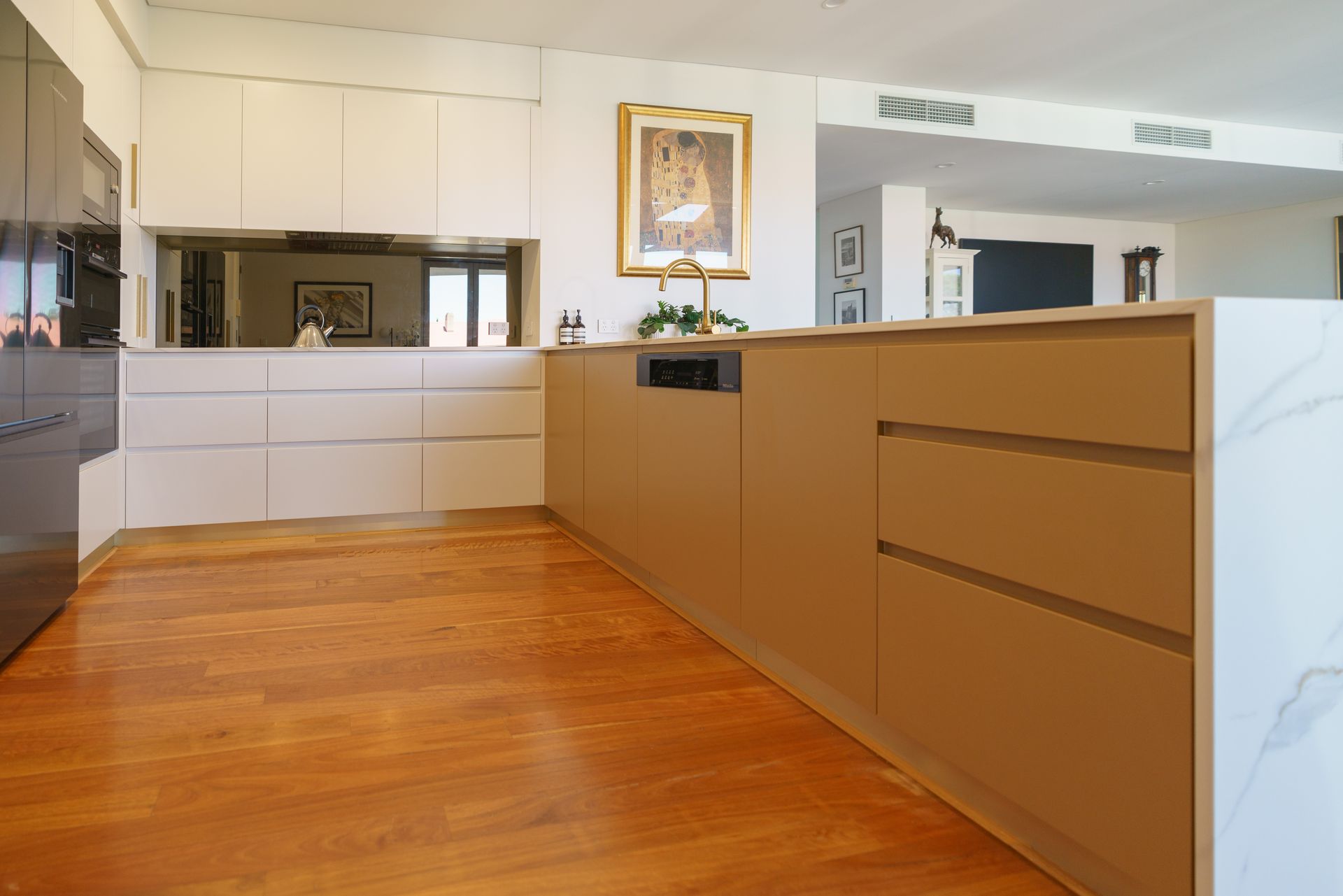 This renovation transformed tired flooring, wall finishes and cabinet work into an amazingly warm and contemporary space.