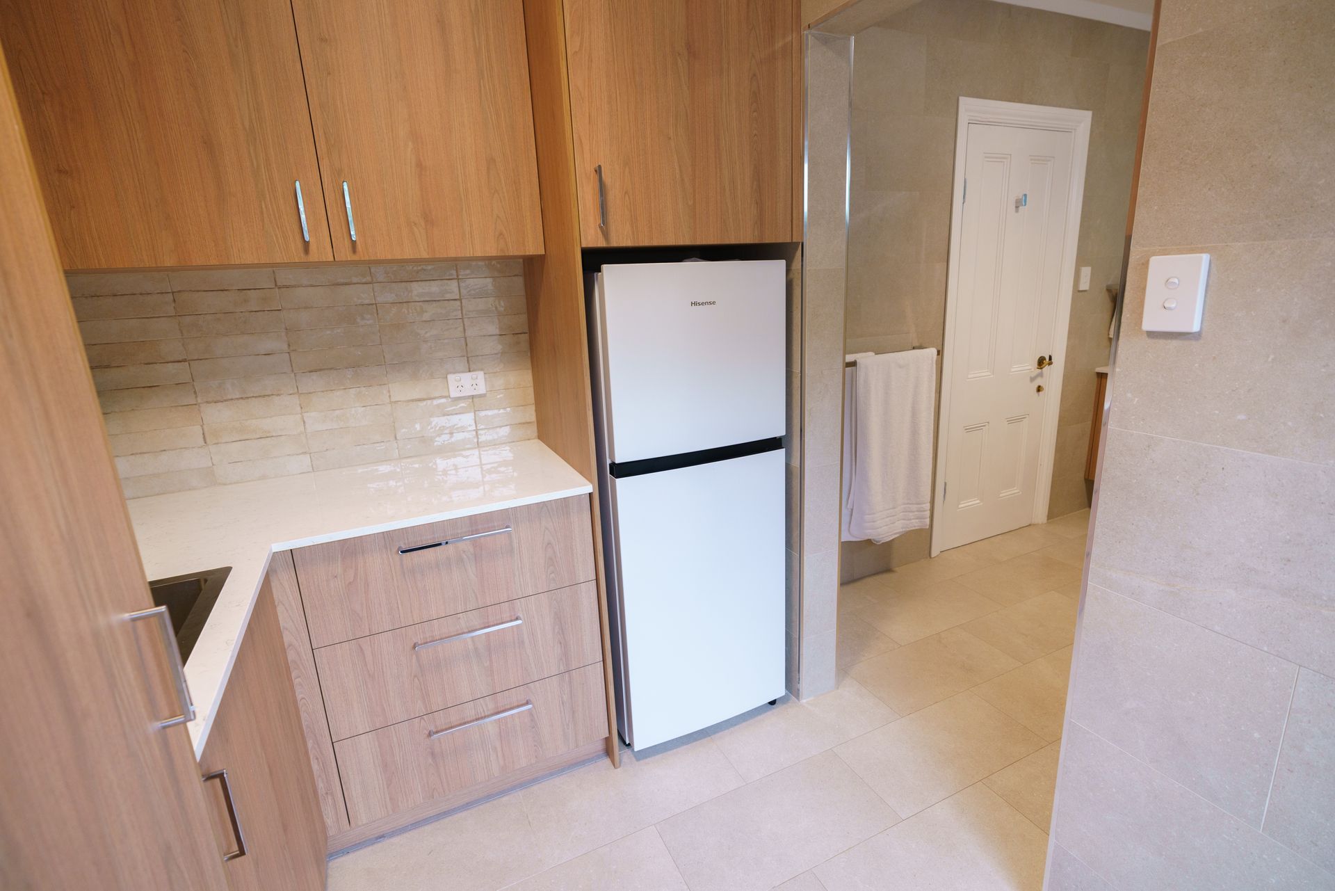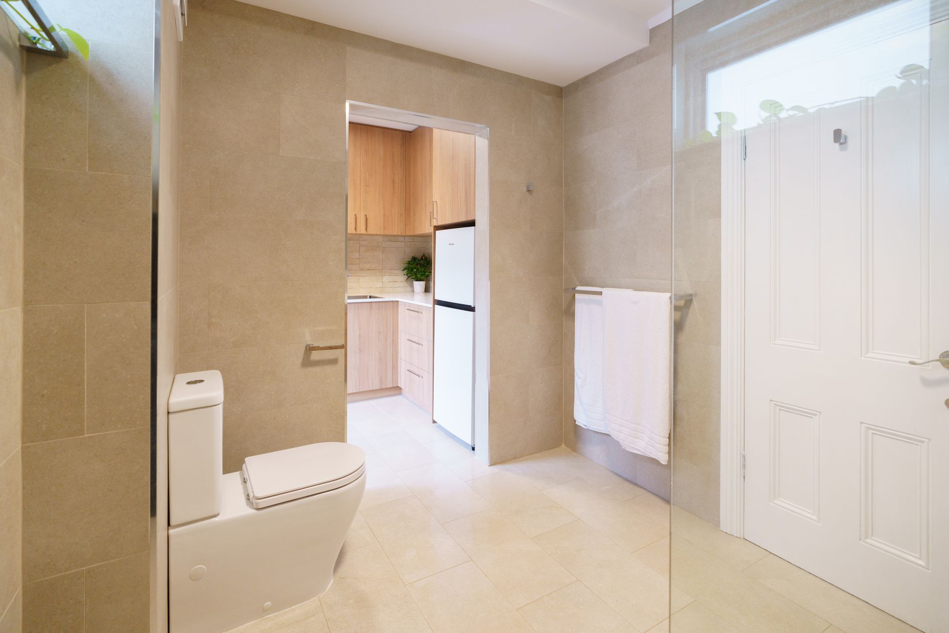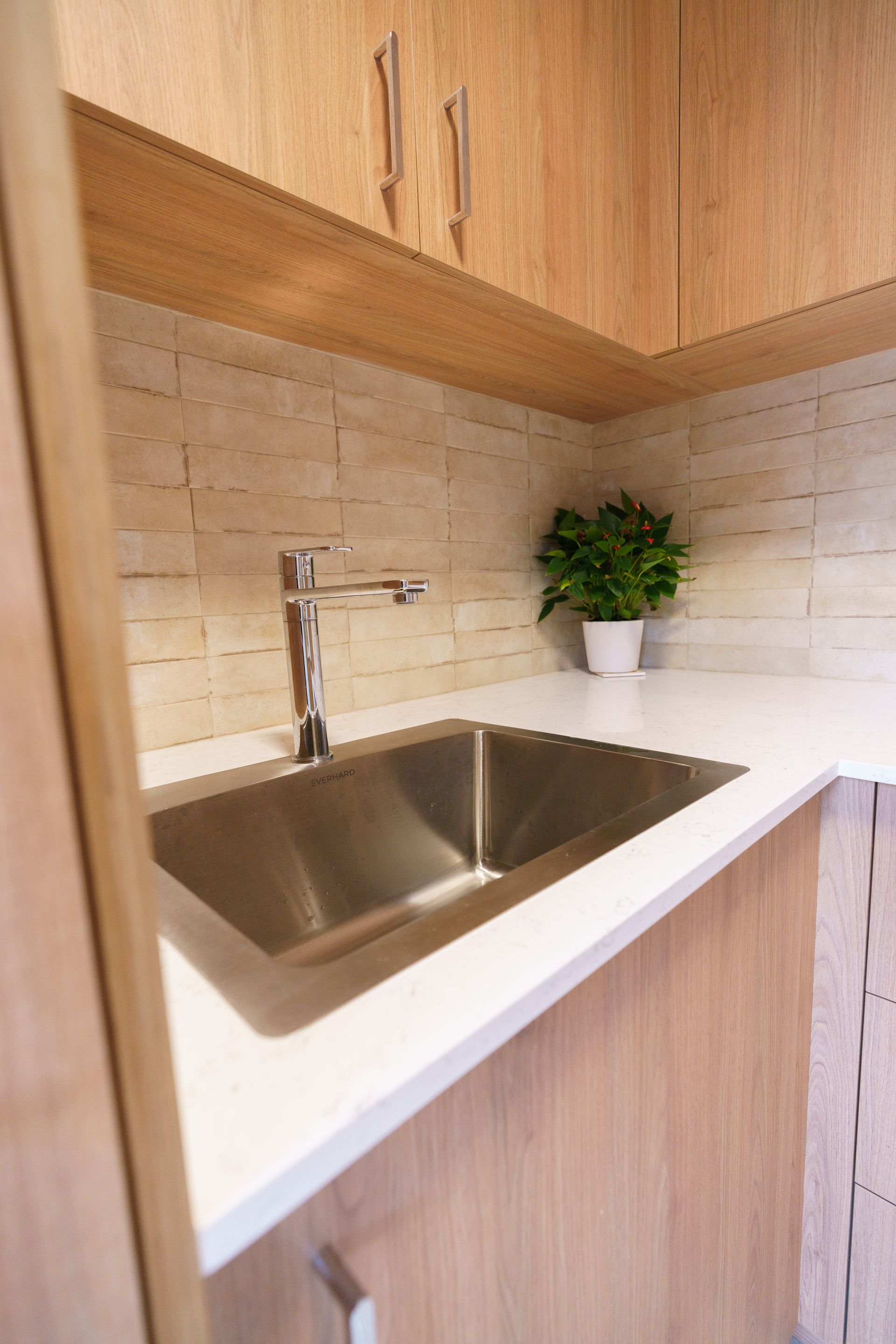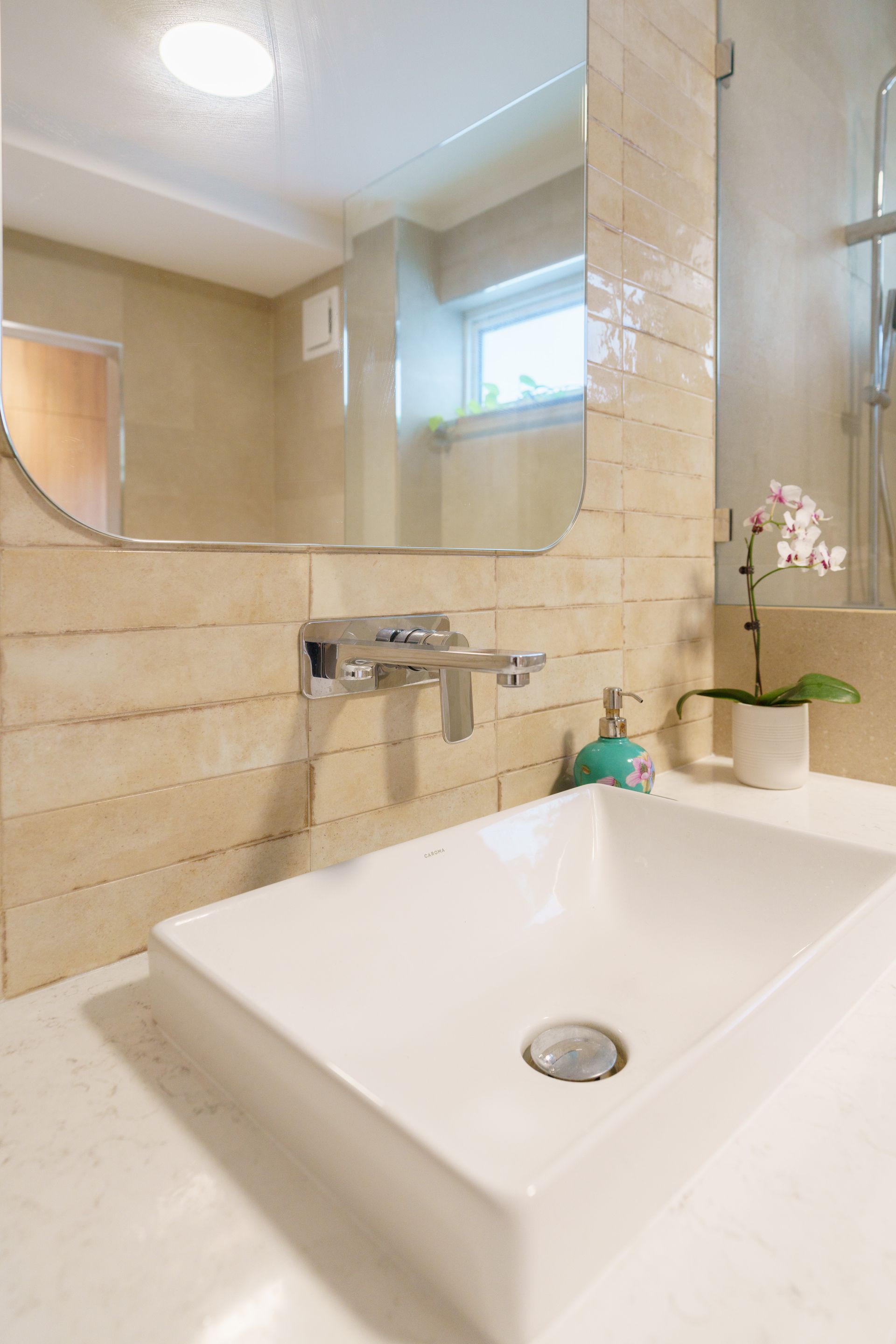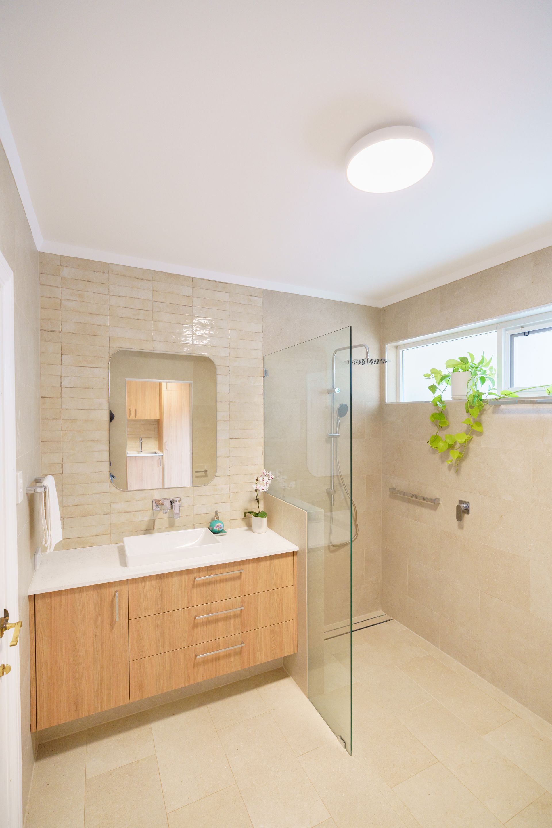 Soft, warm tones and seamless floor finish set off this classic bathroom and laundry renovation.
