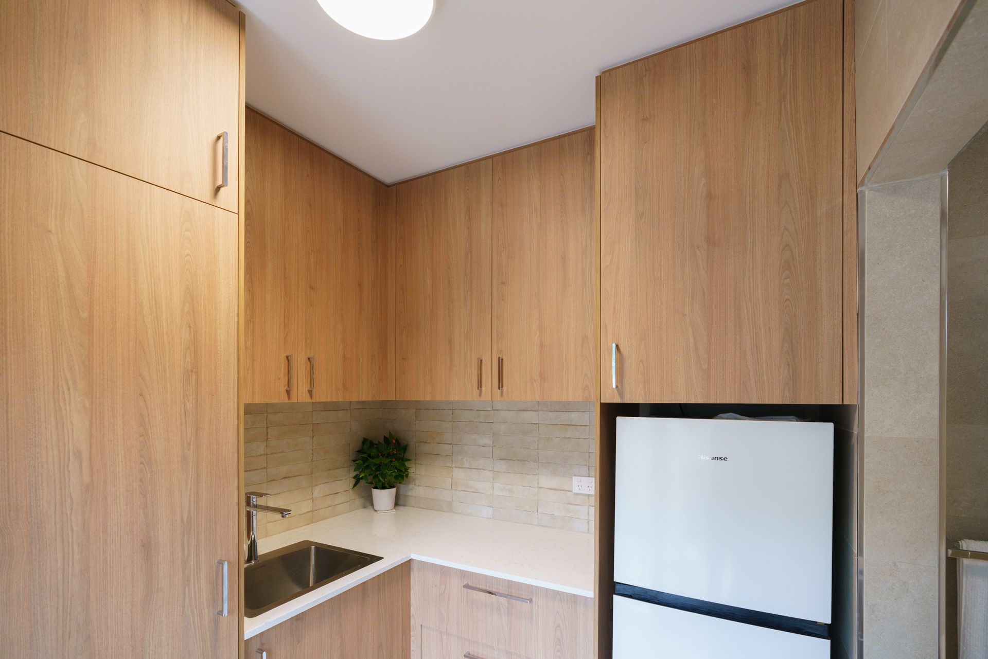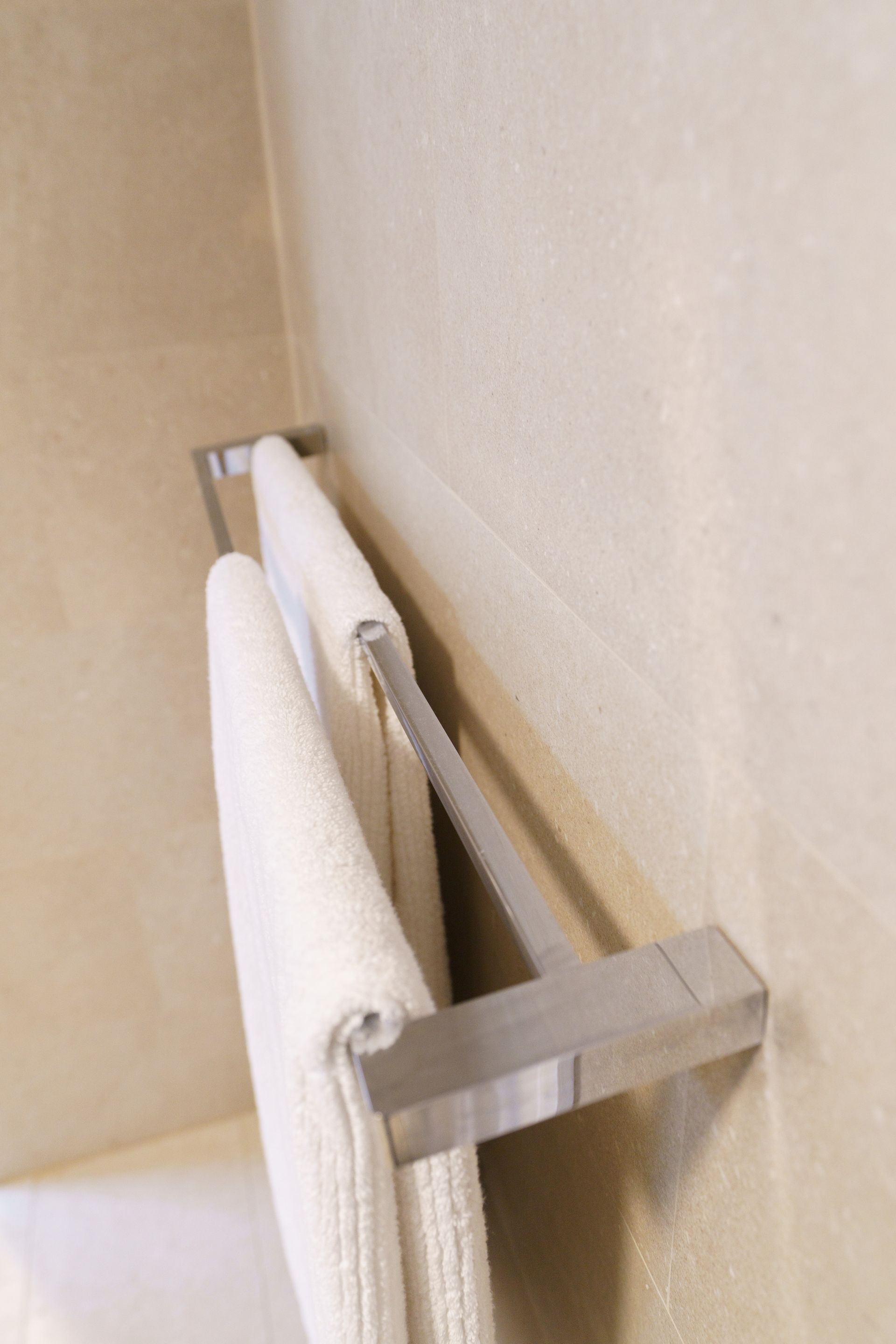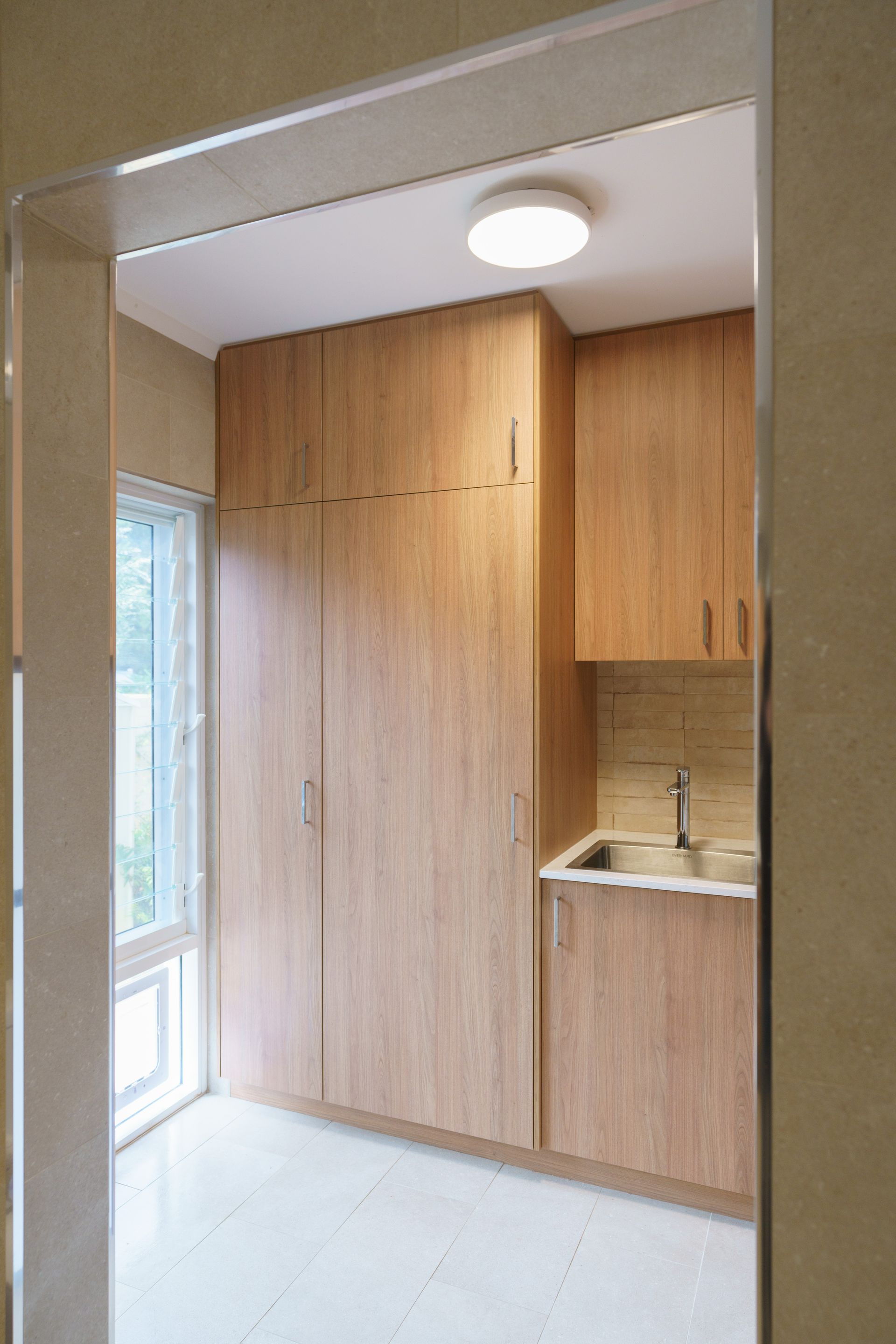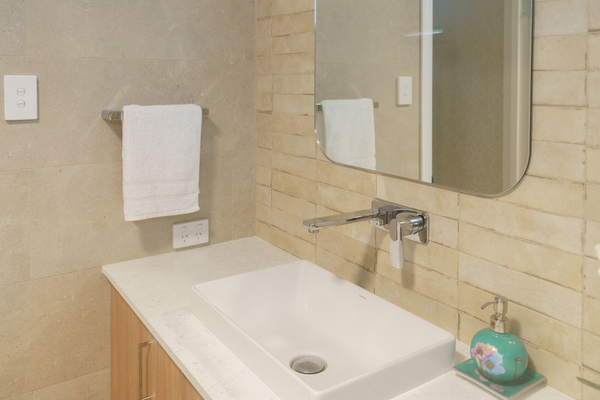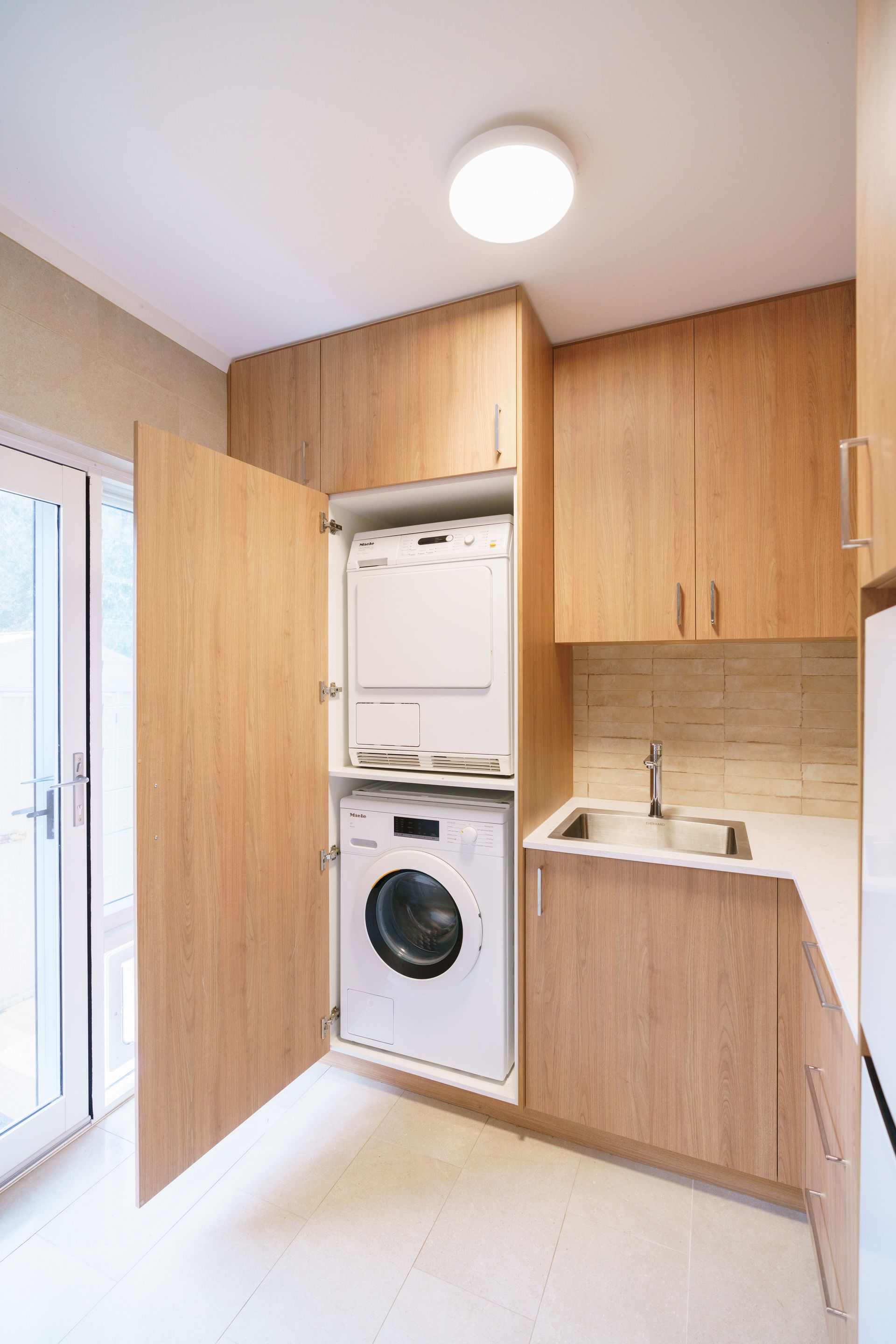 Soft, warm tones and seamless floor finish set off this classic bathroom and laundry renovation.