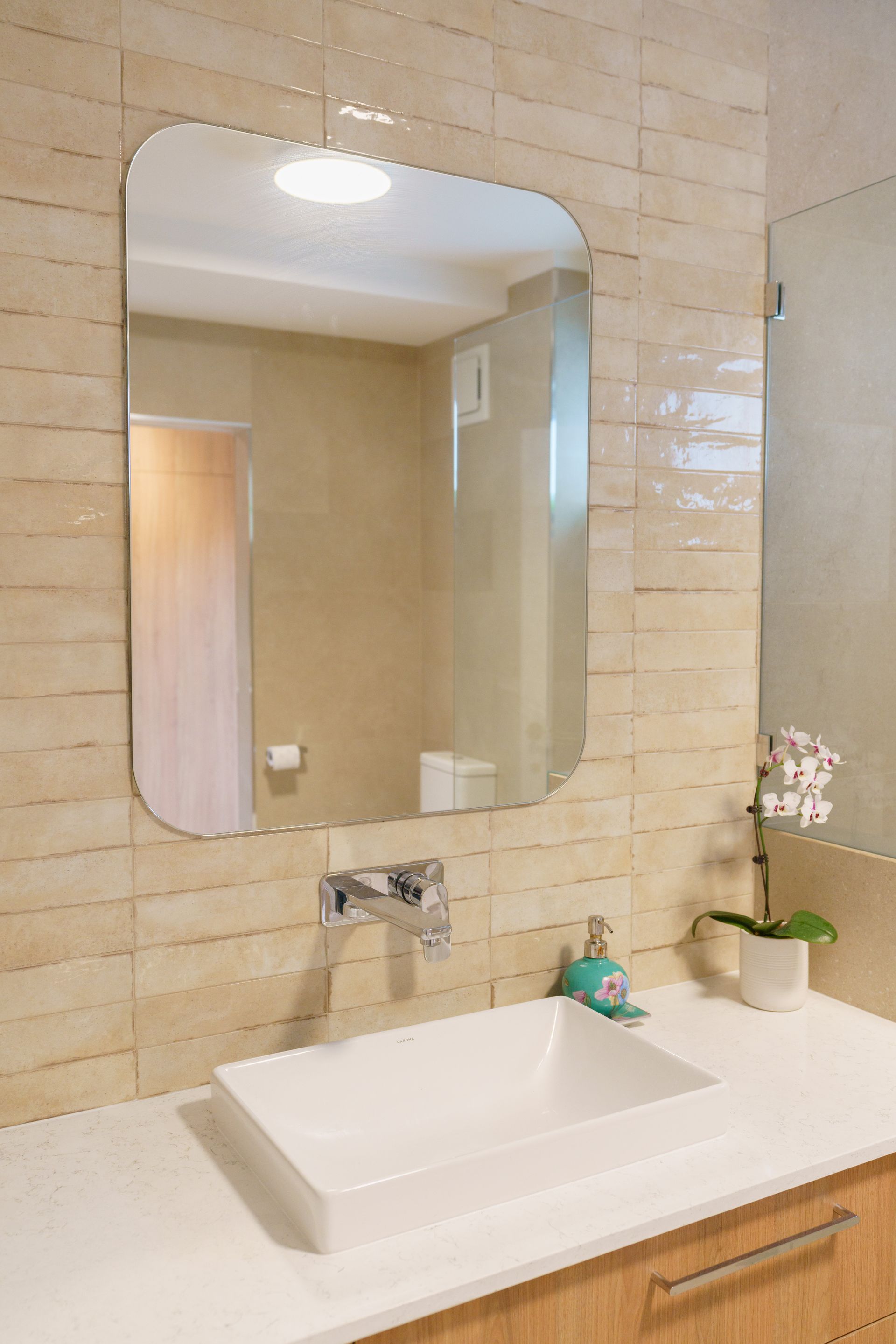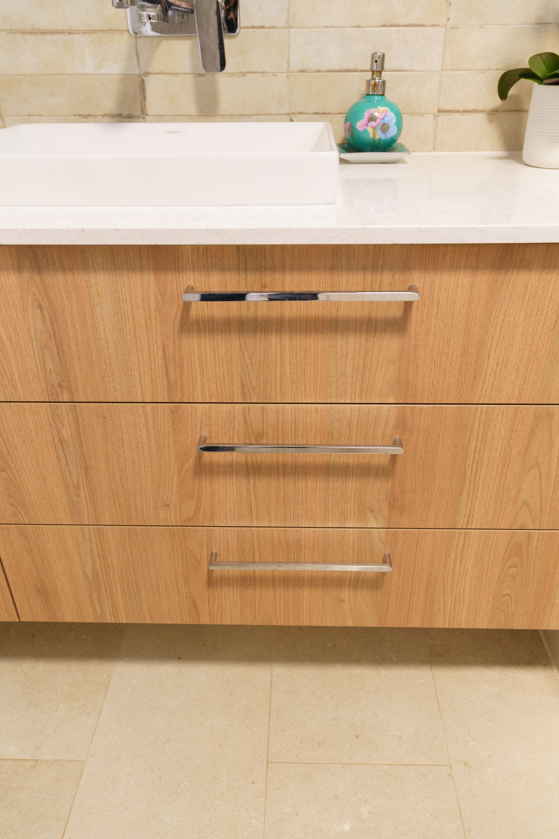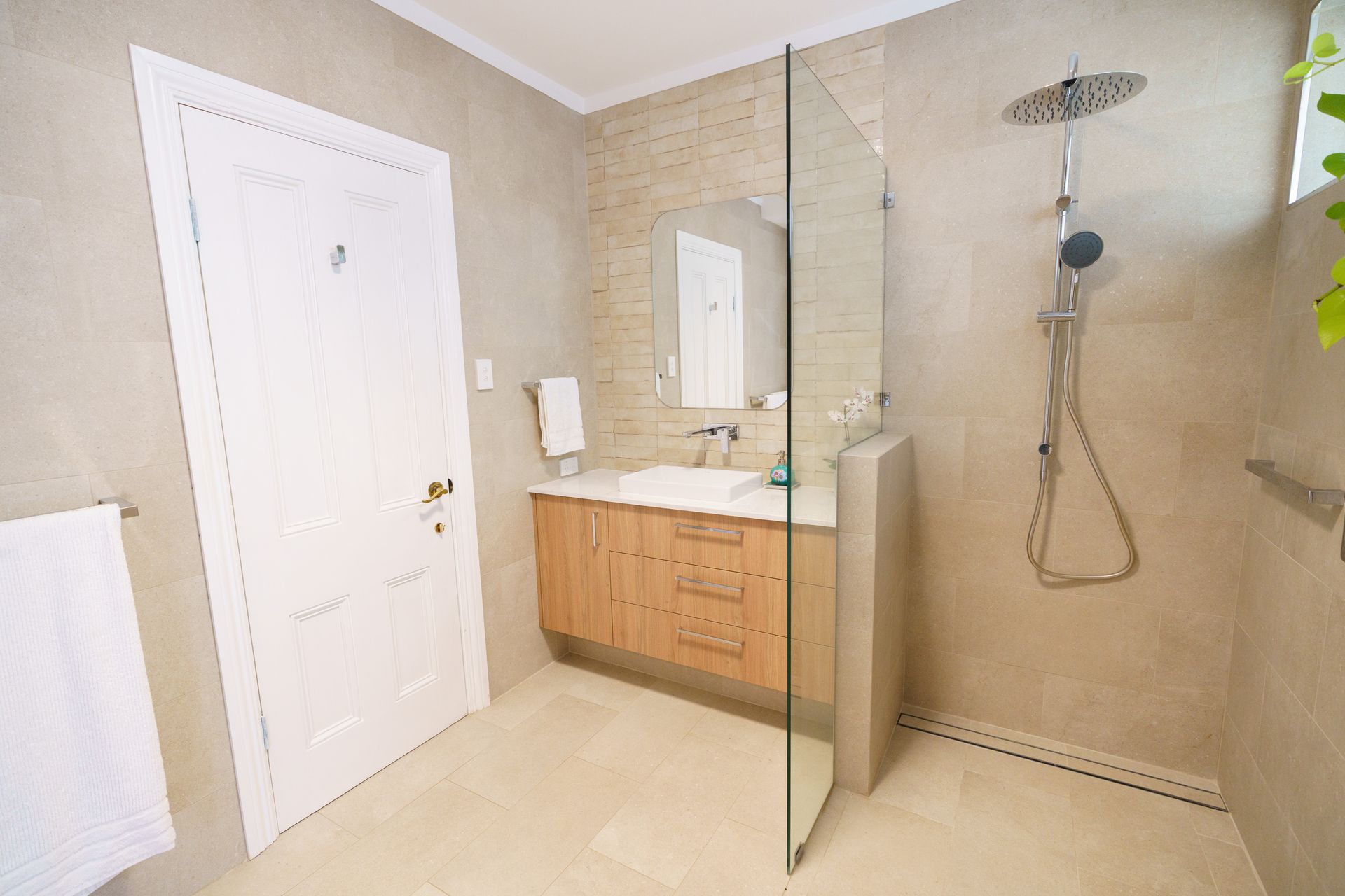 The owners wanted a wide and inviting space with great accessibility. Custom cabinet work and tiling craftsmanship that has the floor tiling gently falling to the strip grate floor waste are standout features.