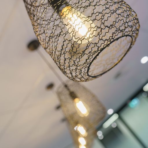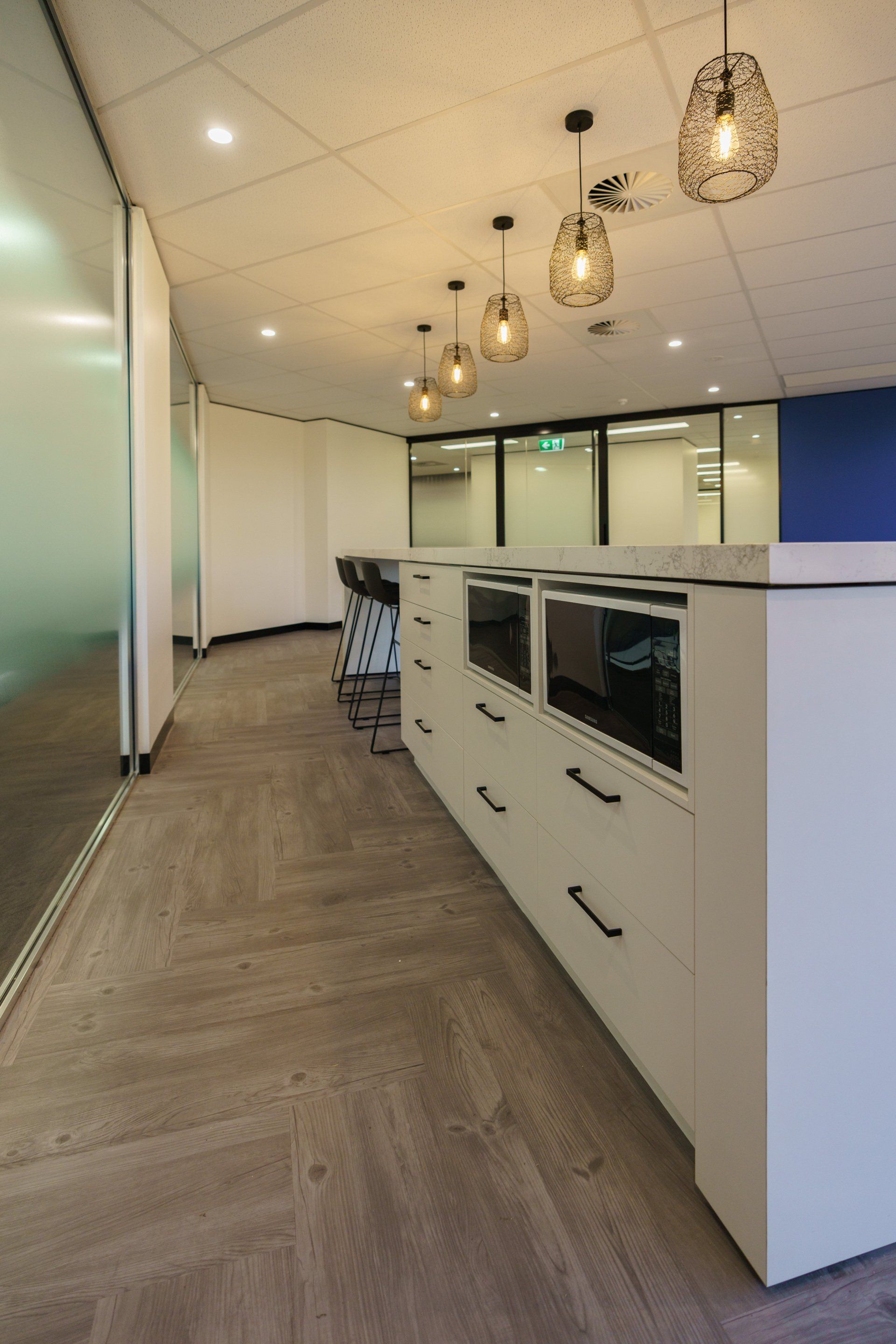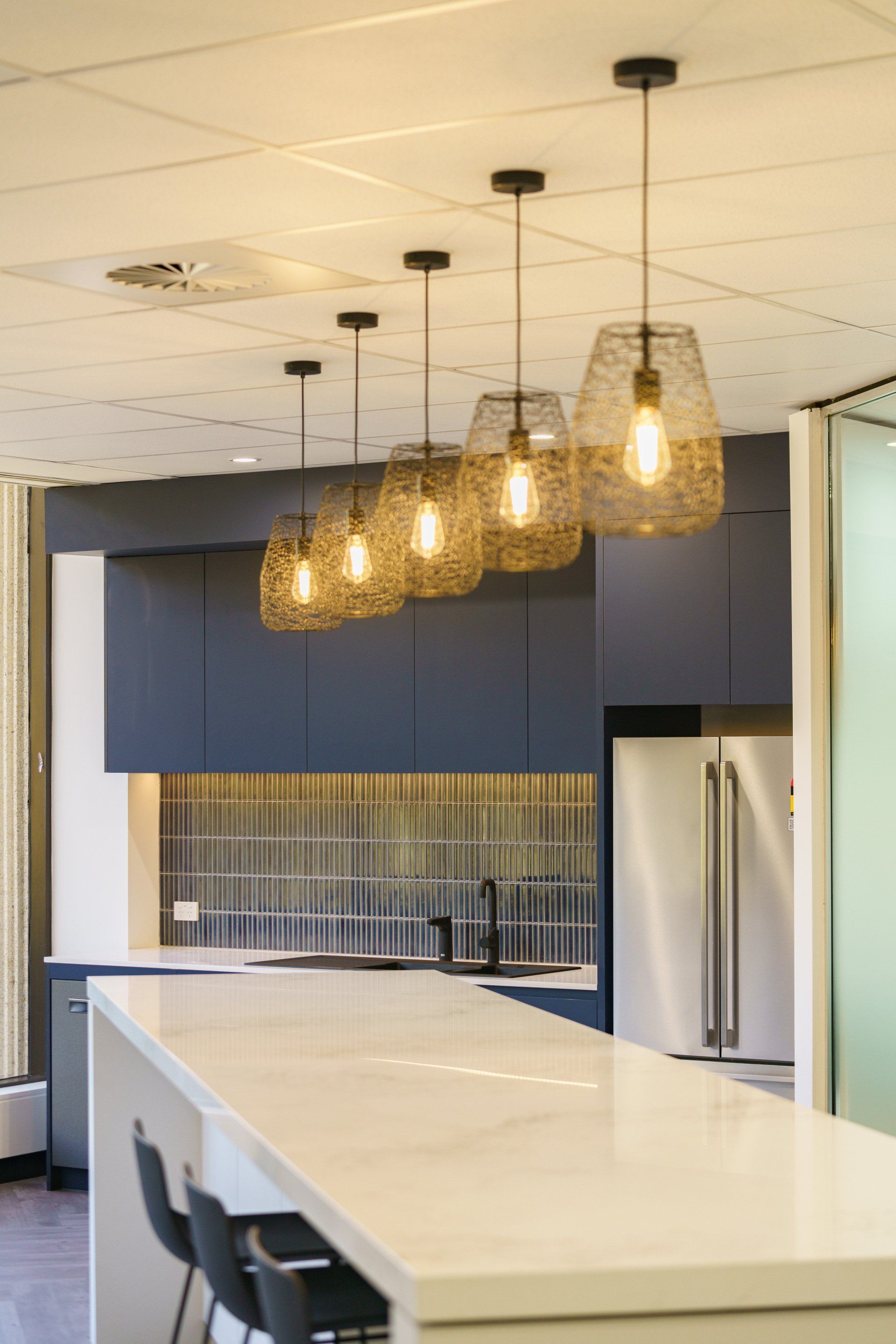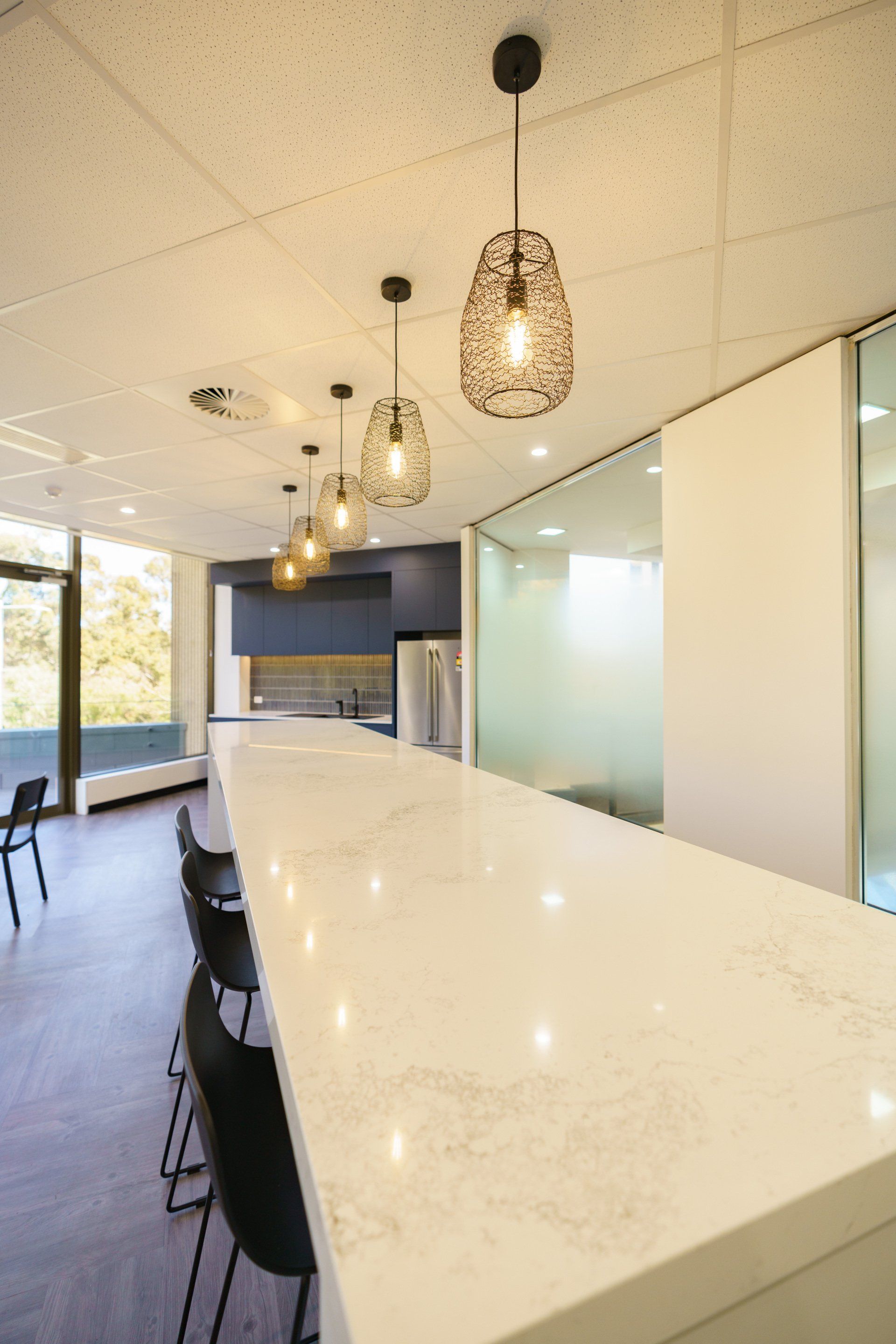 Stunning feature lighting and floor to ceiling glazing keeps this office space open and warm.