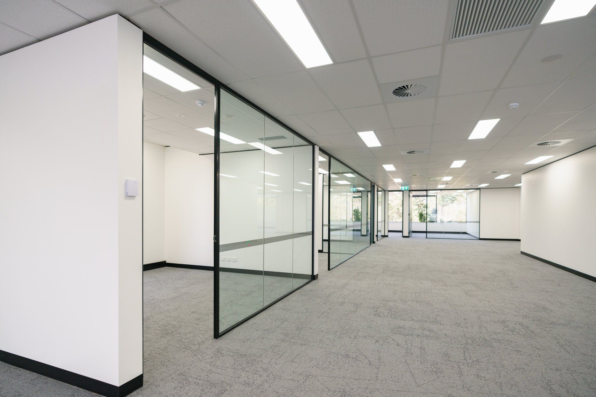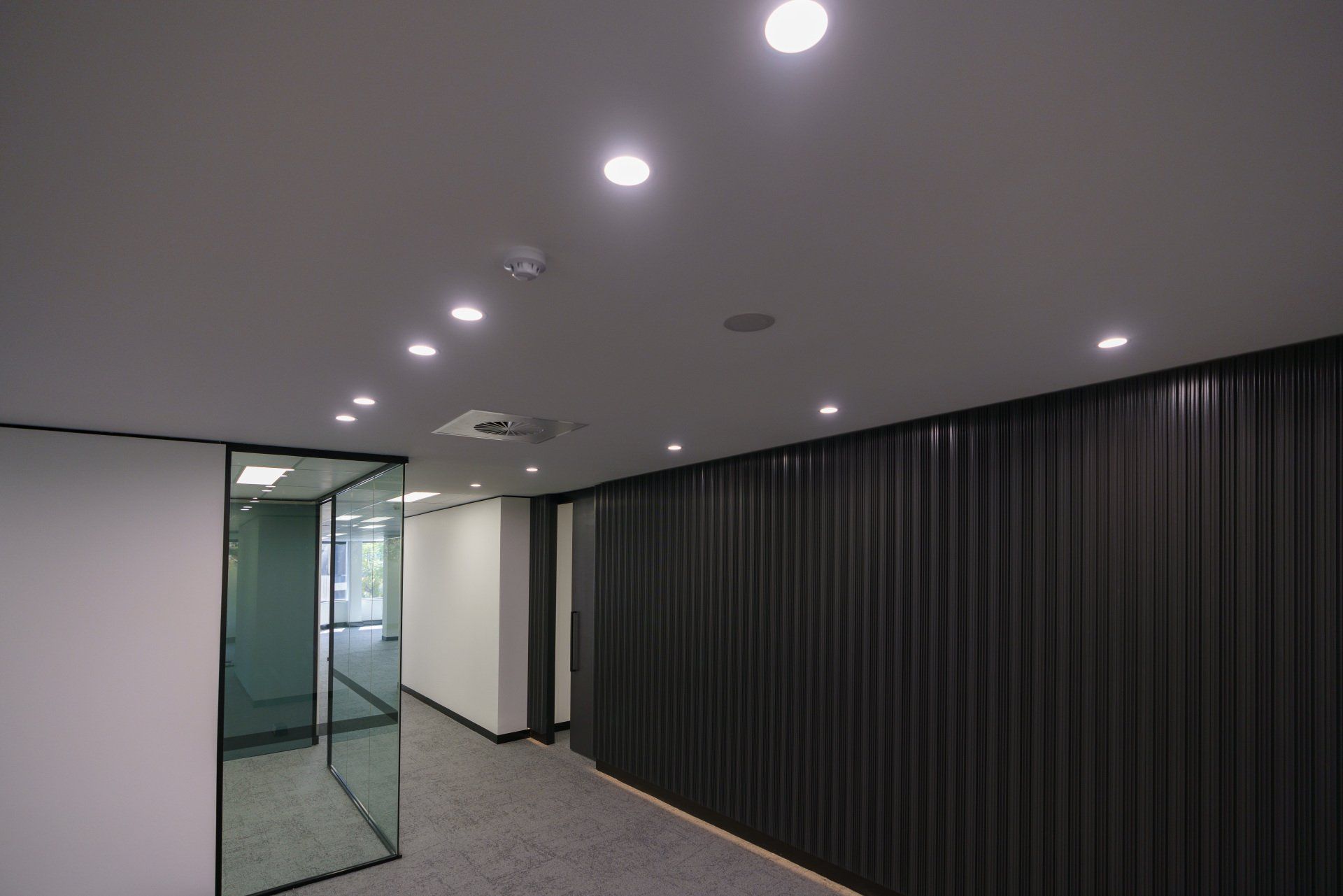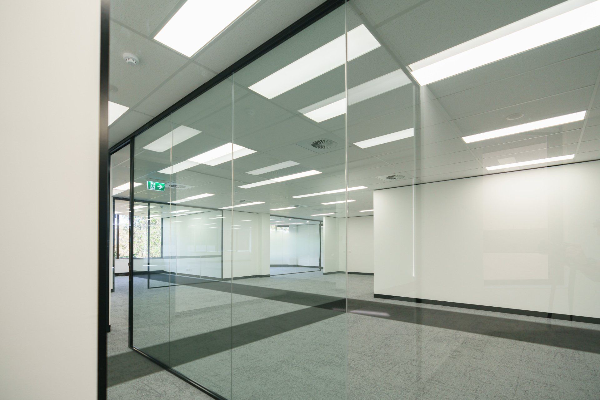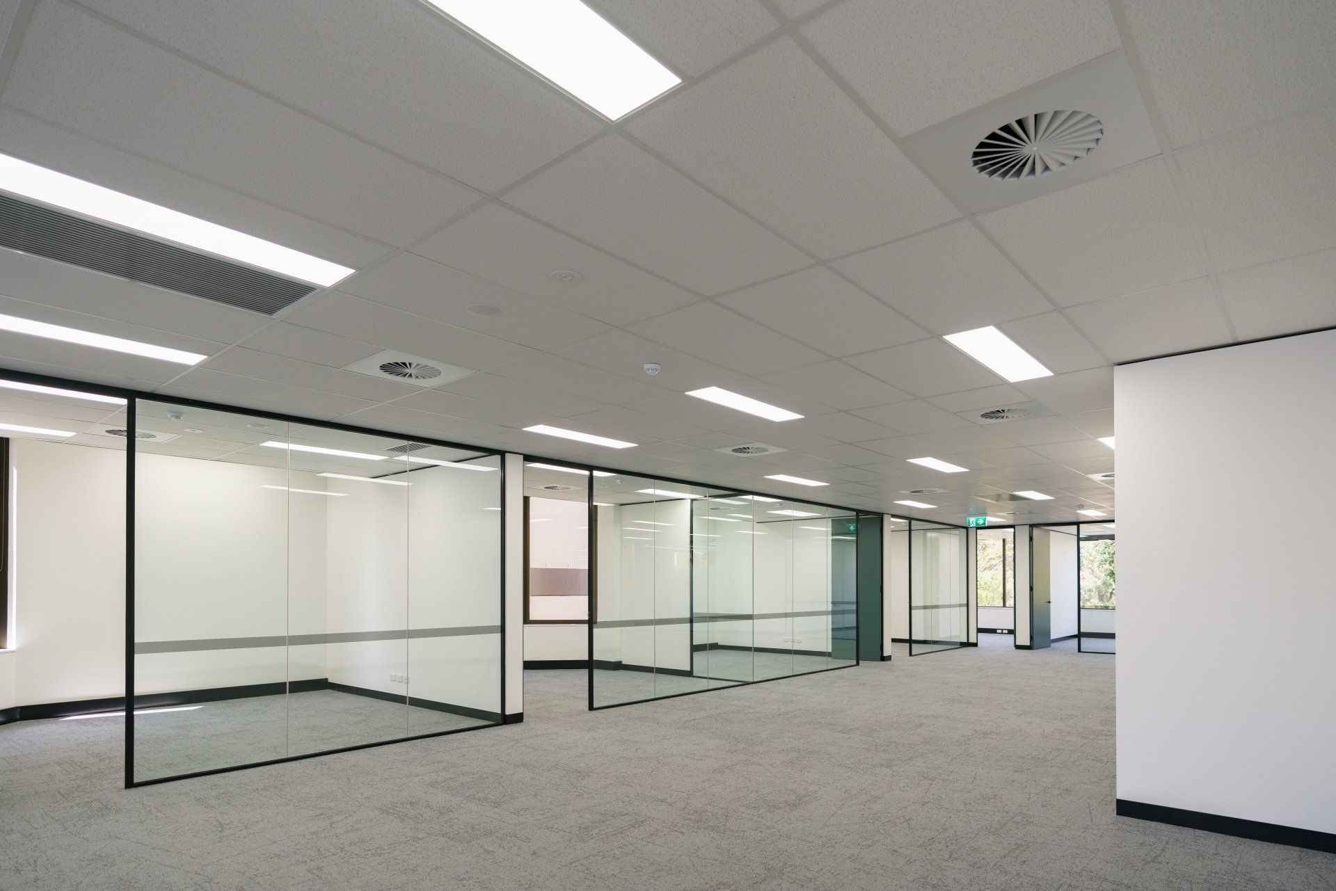 Stunning feature lighting and floor to ceiling glazing keeps this office space open and warm.