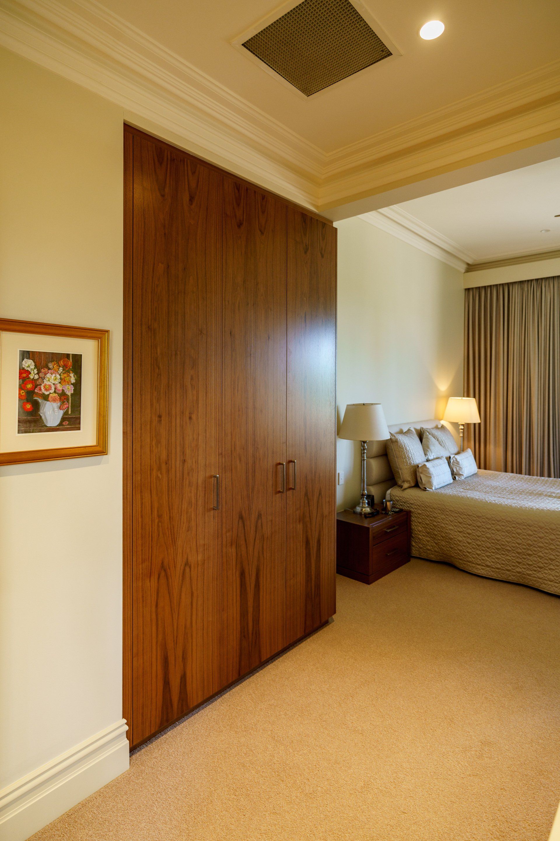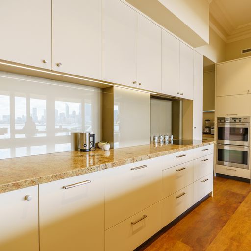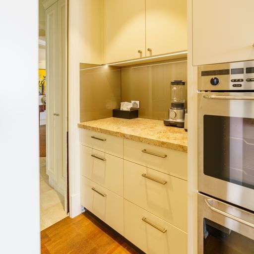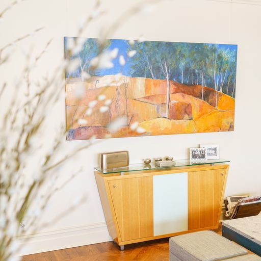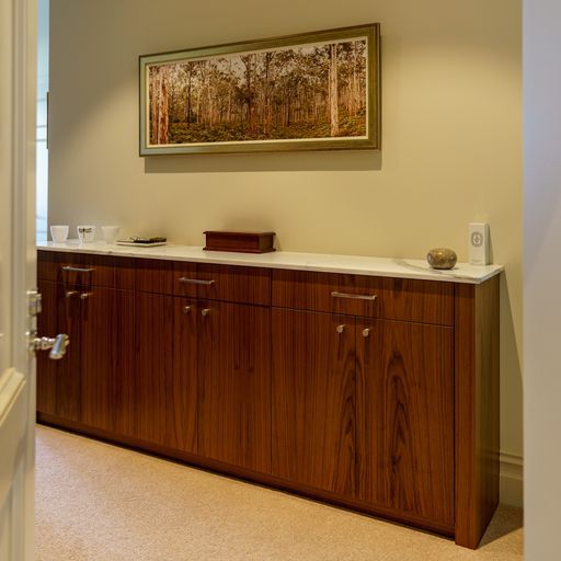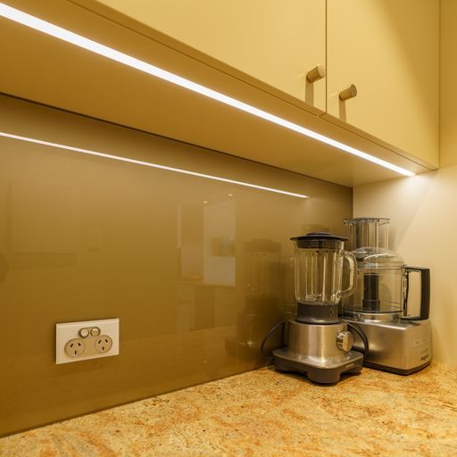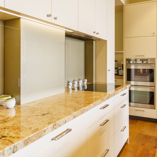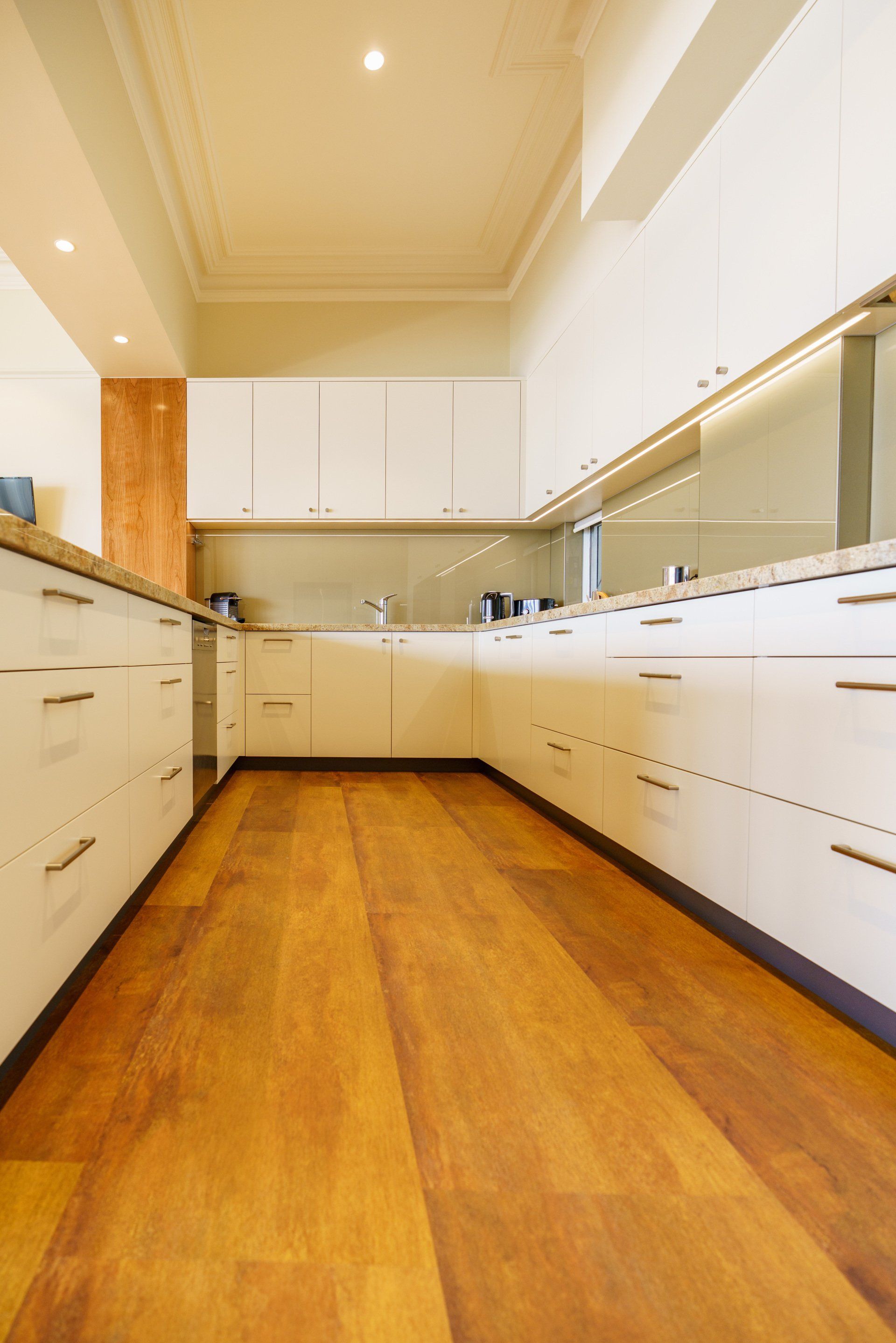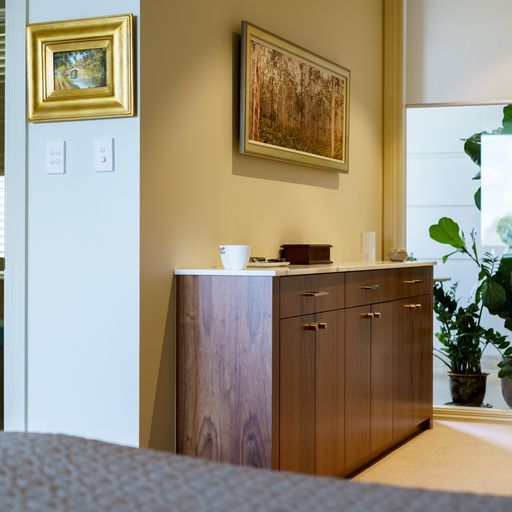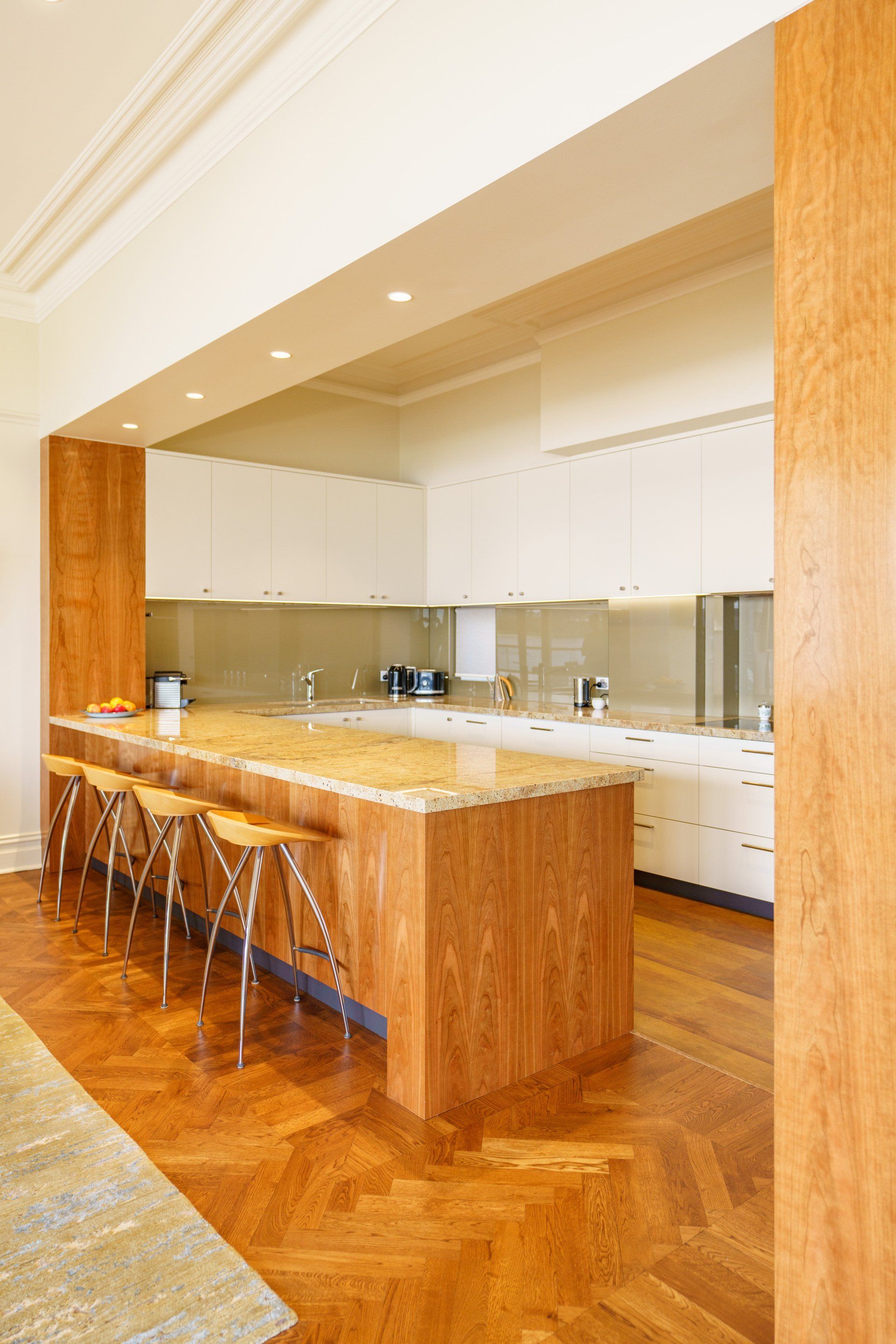 The client's art collection was accommodated with feature lighting and wall color selections. Italian, golden oak granite benchtops in the kitchen creates a wonderful glitzy feature in this space.
