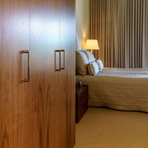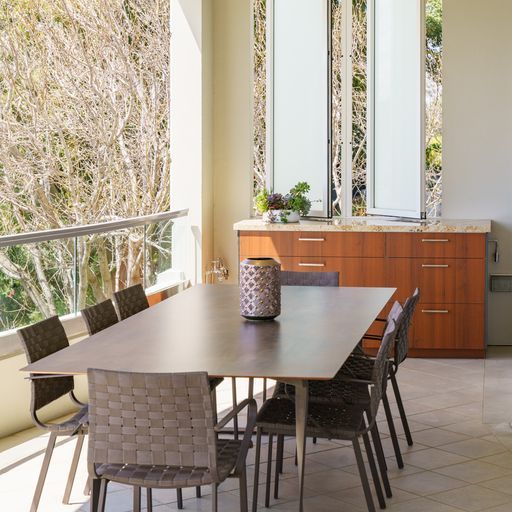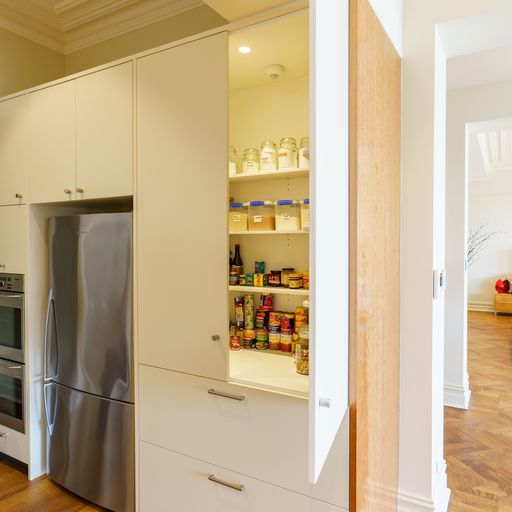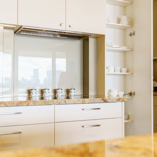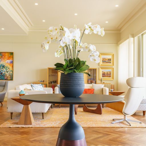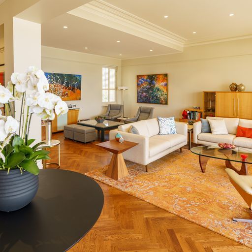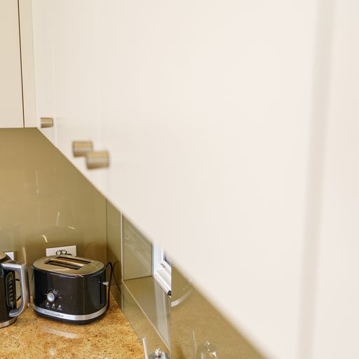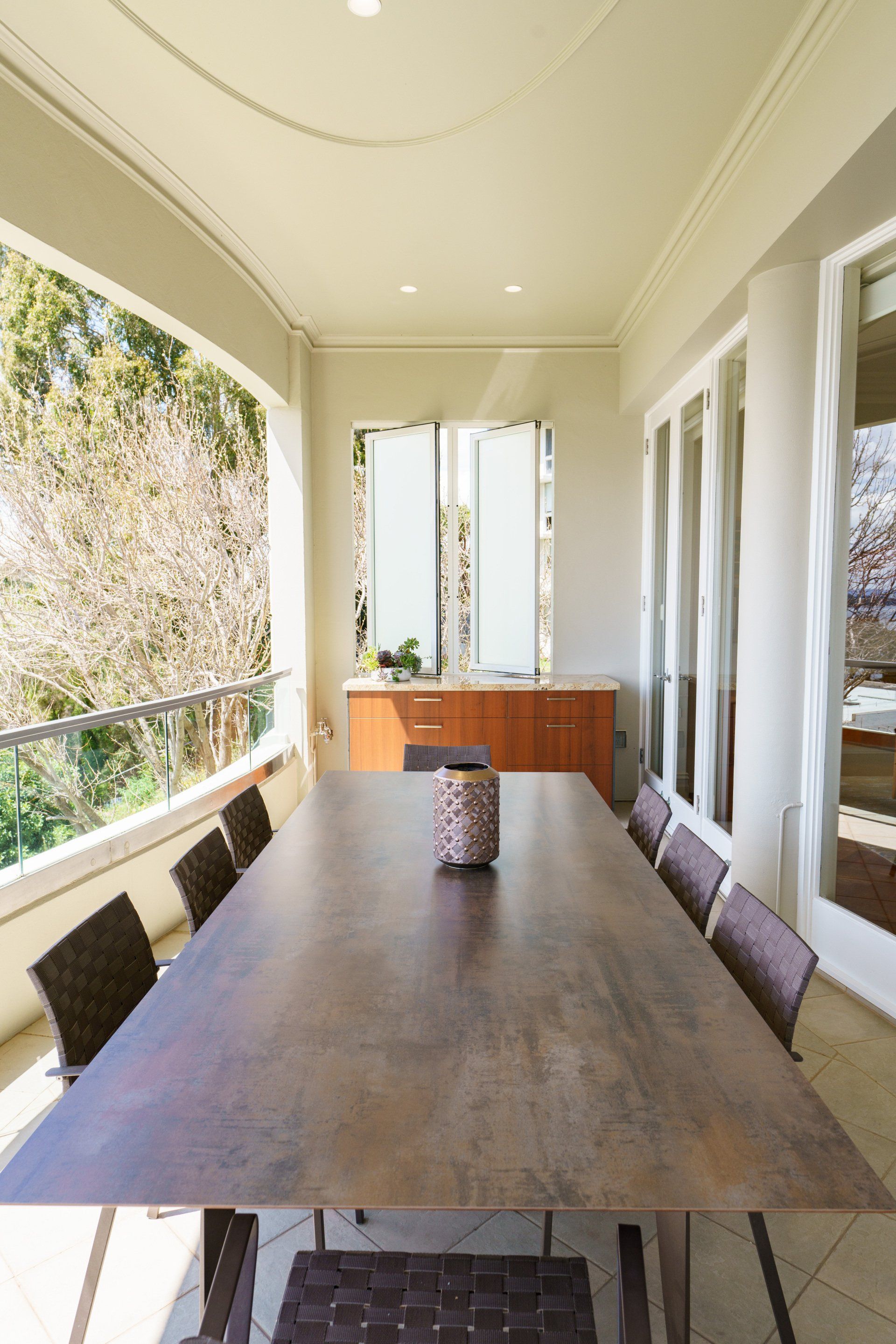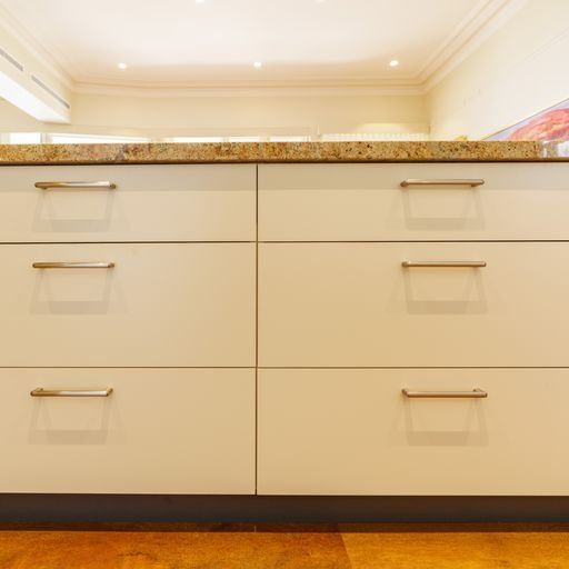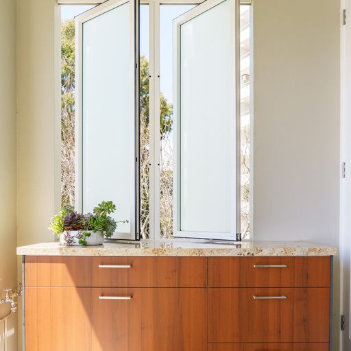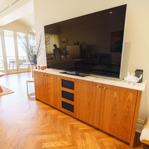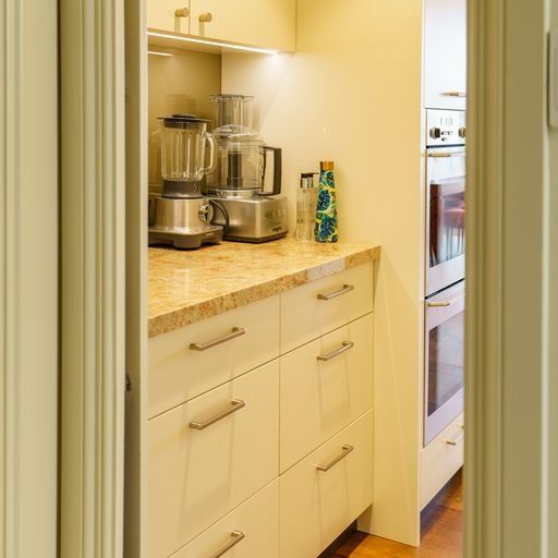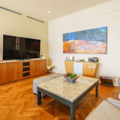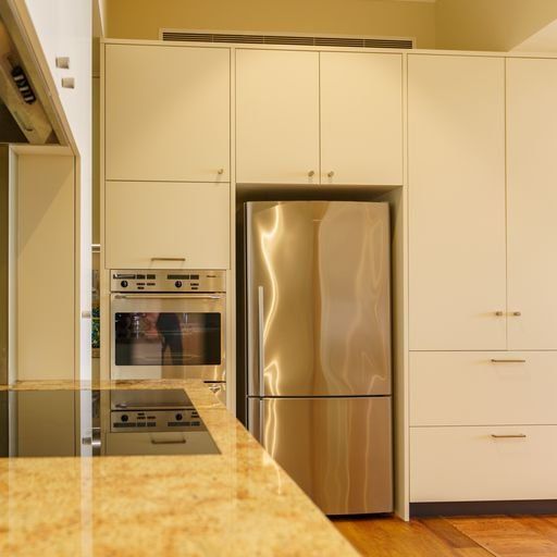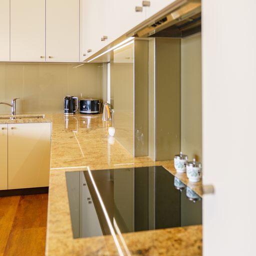 The client's art collection was accommodated with feature lighting and wall color selections. Italian, golden oak granite benchtops in the kitchen creates a wonderful glitzy feature in this space.