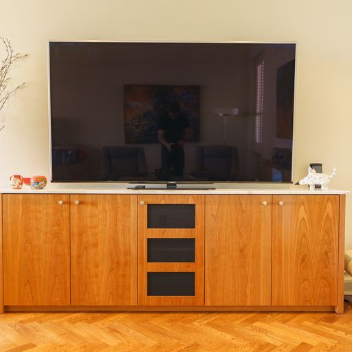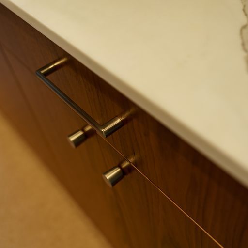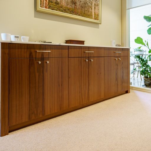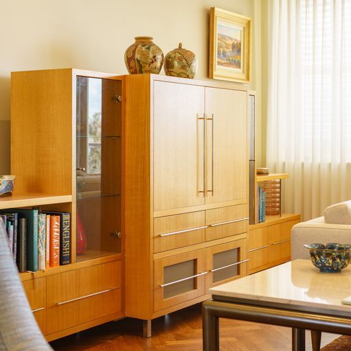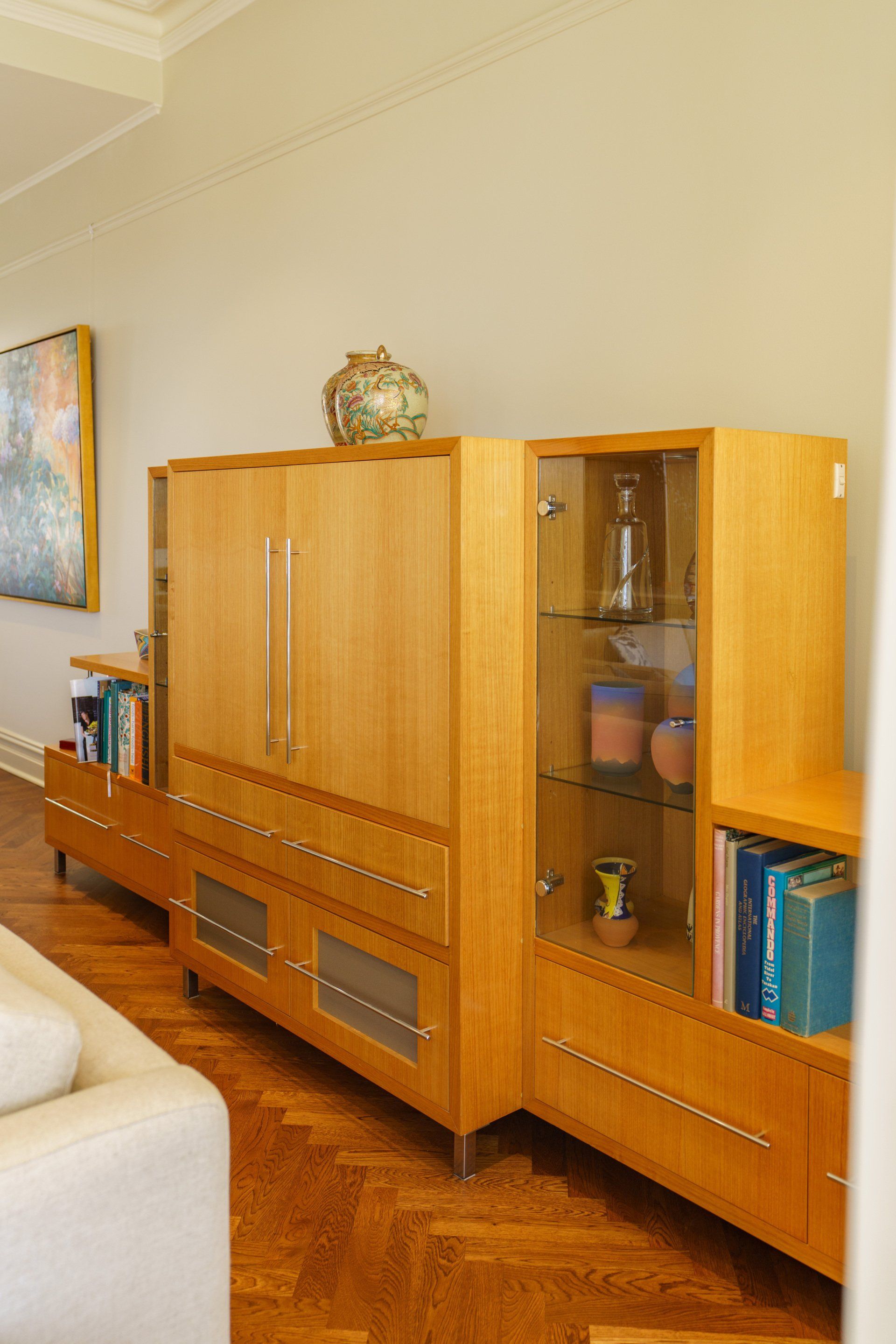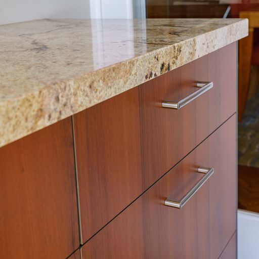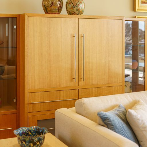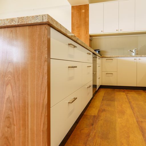 This renovation transformed tired flooring, wall finishes and cabinet work into an amazingly warm and contemporary space.